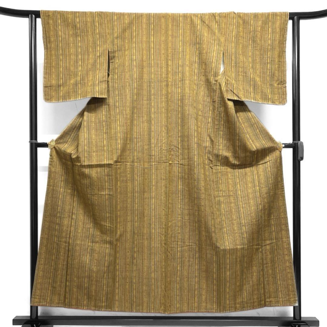 くすみイエローの地に花織調でおられれ刺繍と縦縞の文様がお洒落なデザインの一着です。