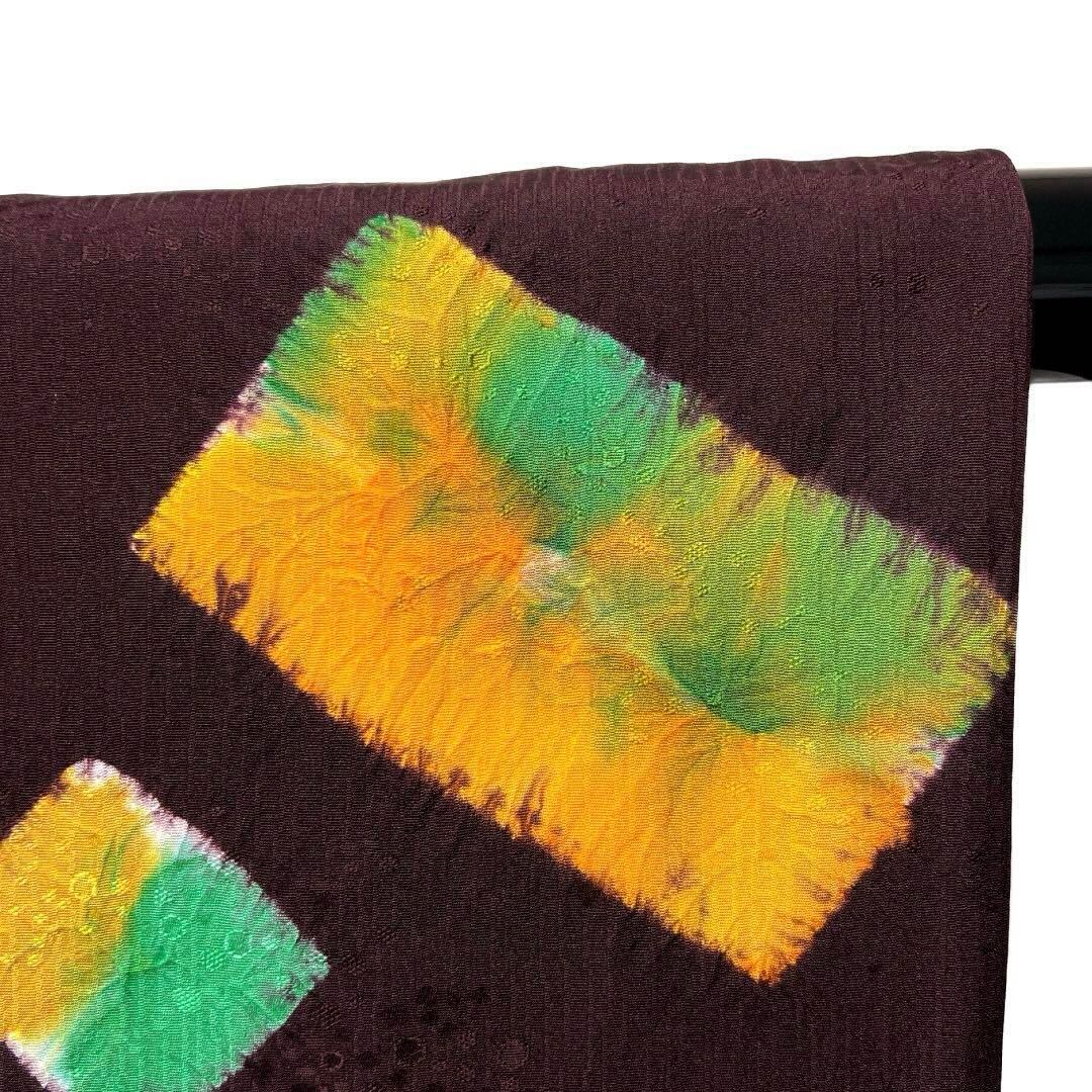 深い似せ紫色地に映える絞りで描かれた抽象的な色紙模様が目を惹くお洒落なデザインの一着です。