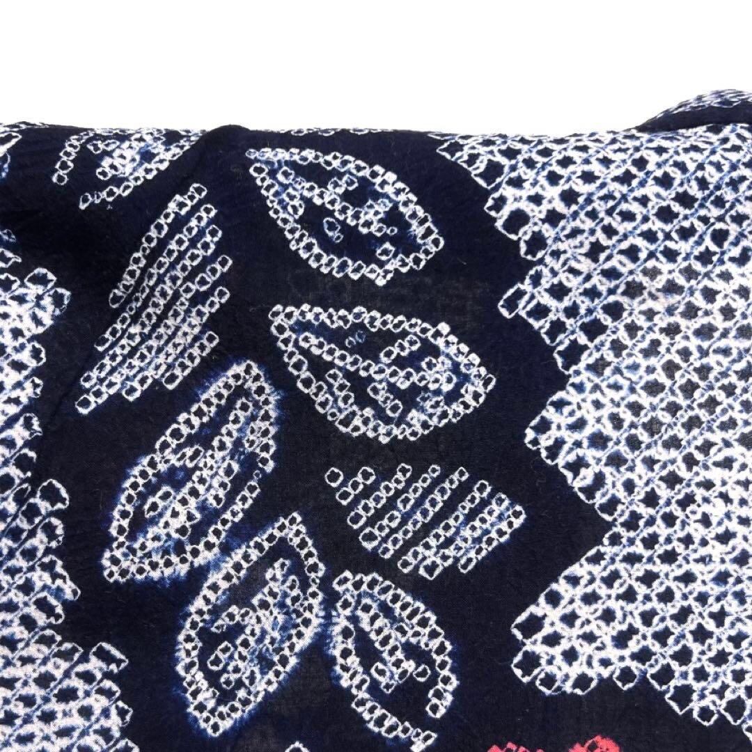 ネイビーの藍染の地に絞りで細やかに描かれた向日葵とリーフに花模様が華やかなデザインの一着です。