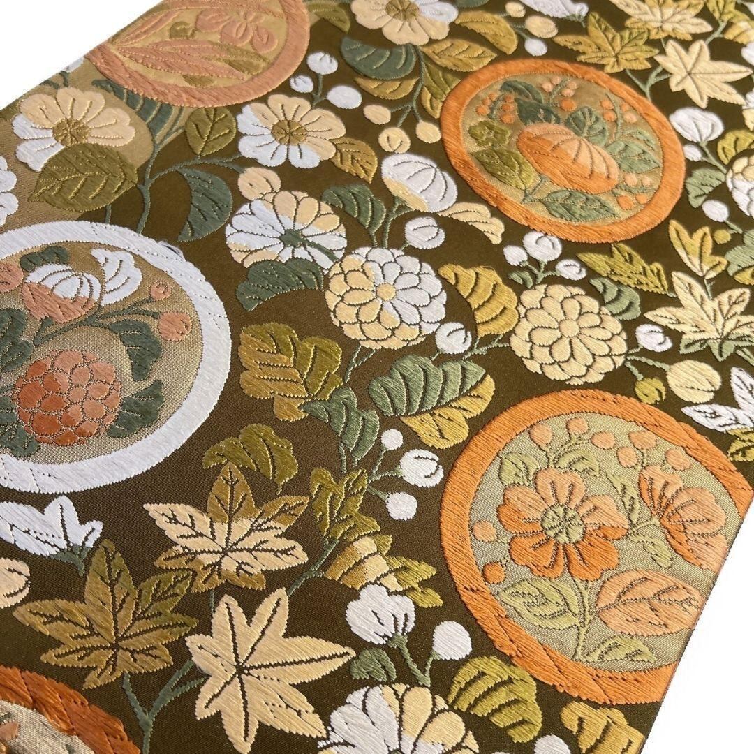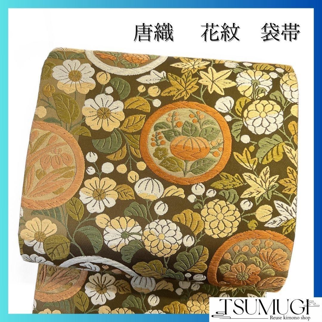 唐織で橘紋や菊花紋、菖蒲文などの花紋が織り出された袋帯です。