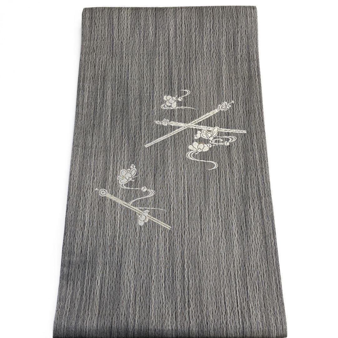 よろけ織りと唐織で梅花や簪が織り出された袋帯です。