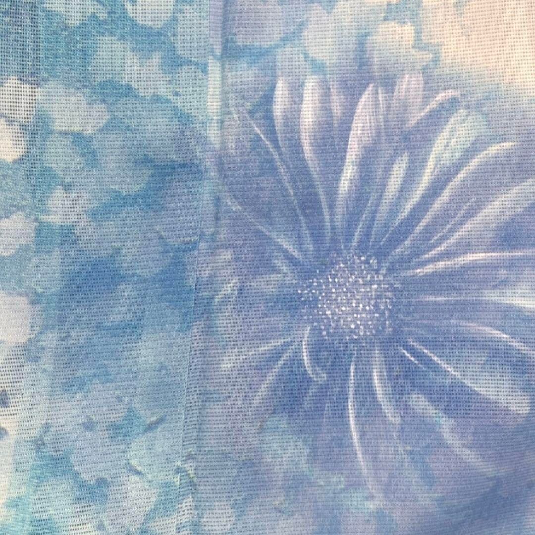 グレーの絽の地にブルーのグラデーションで描かれたリーフと菊花の文様にモンシロチョウとアゲハ蝶が可愛いお洒落なデザインの一着です。