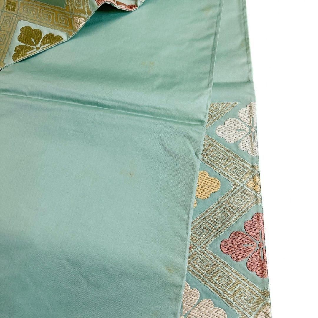 瓶覗色の爽やかなお色味に花菱の可愛らしい唐織が映えるデザインの一着です。