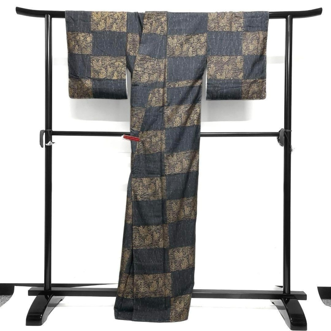 紬のグレー地の市松模様の中に板締めと金彩で描かれた花模様やリーフの文様が描かれた華やかな一着です。