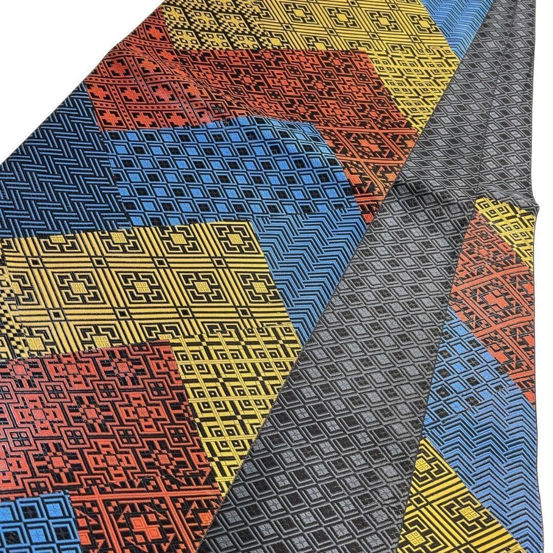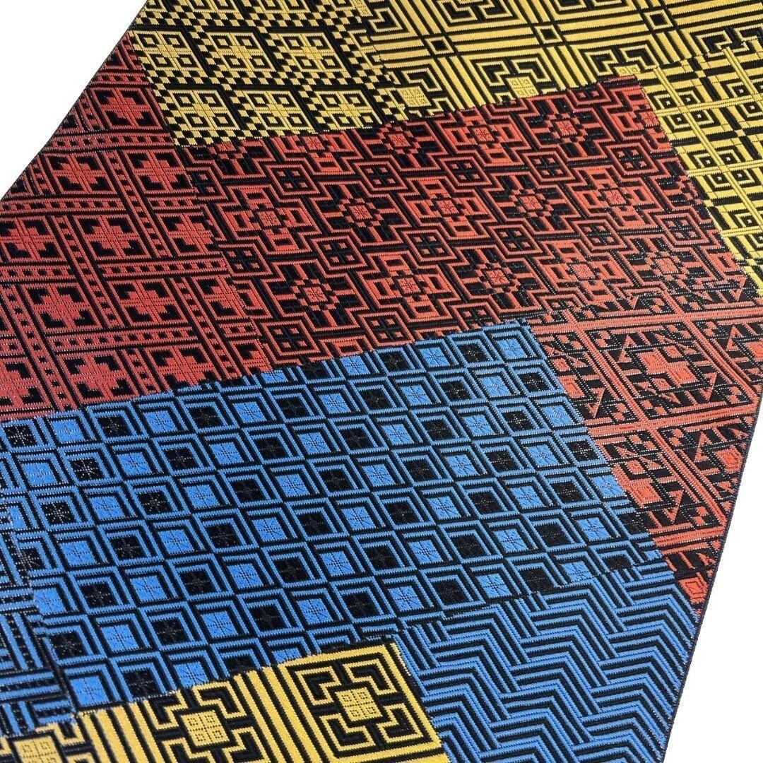 三原色の華やかなお色味で菱模様や花菱、檜垣模様 、武田菱が織り出された一着です。