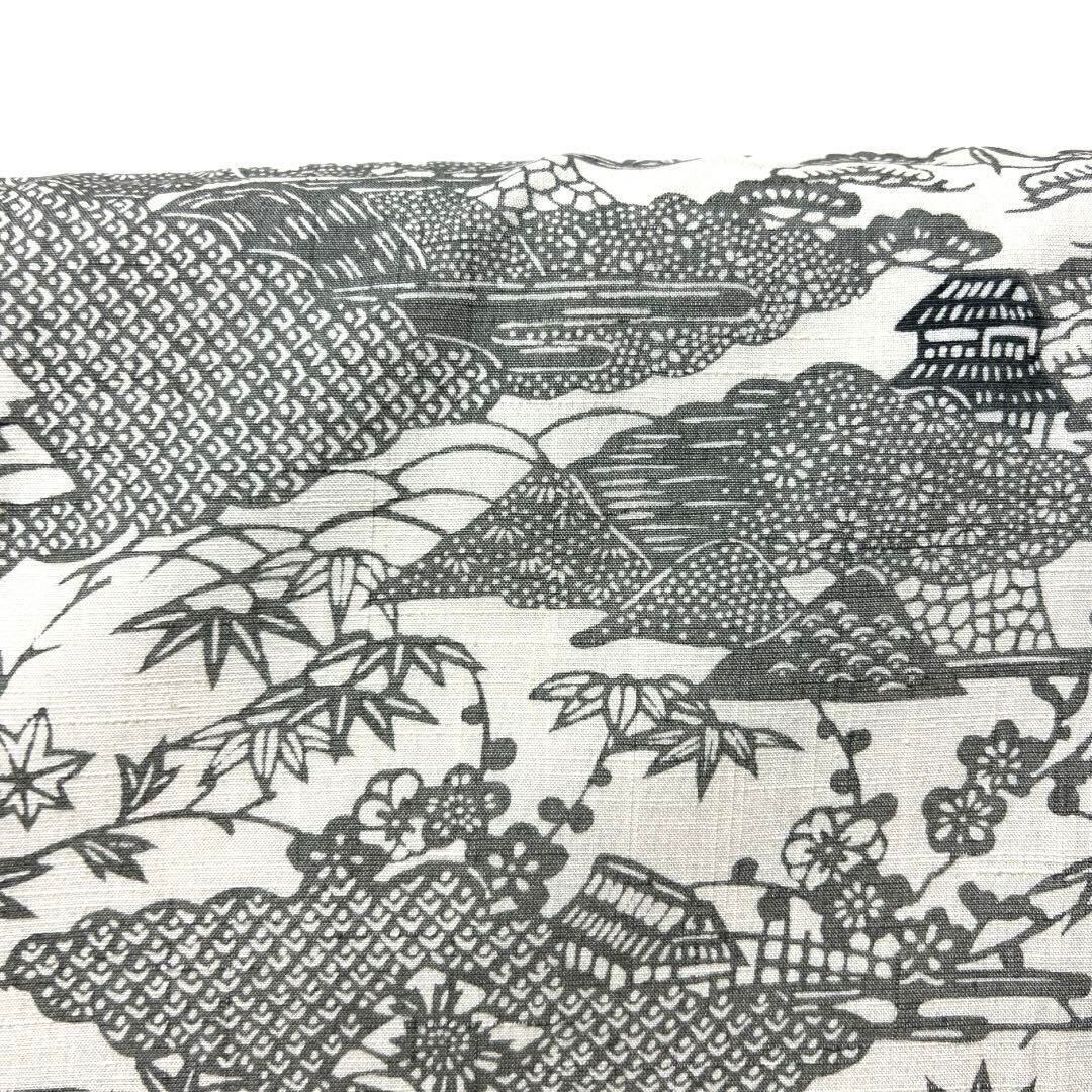 アイボリーの地にグレーと黒の型染で描かれた松竹梅と風景模様がお洒落なデザインの一着です。