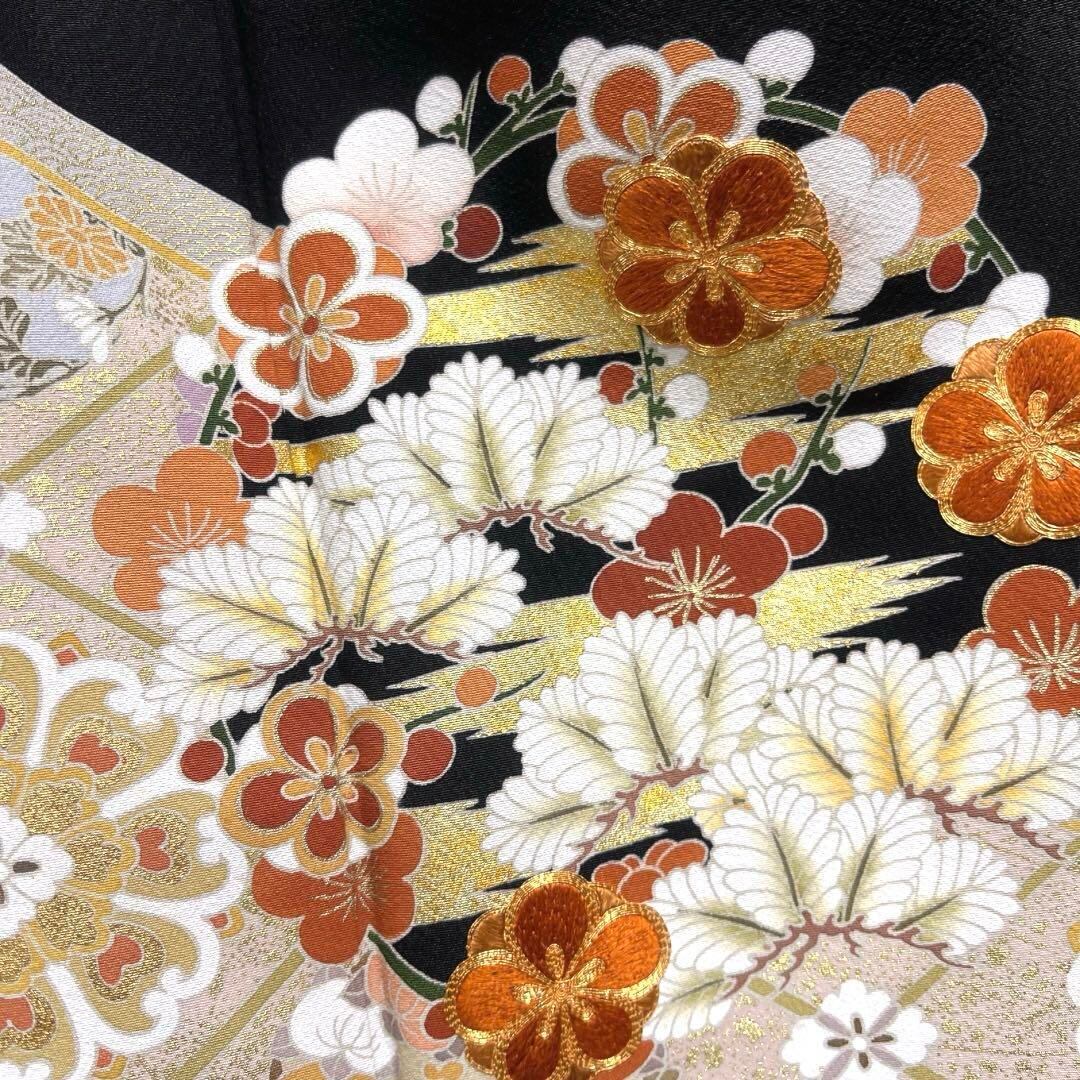 黒地に映える金駒刺繍と金彩を交えて描かれた梅や松、橘や楓、菊、桔梗の花紋に花菱の文様が華やかで絢爛な雰囲気の一着です。