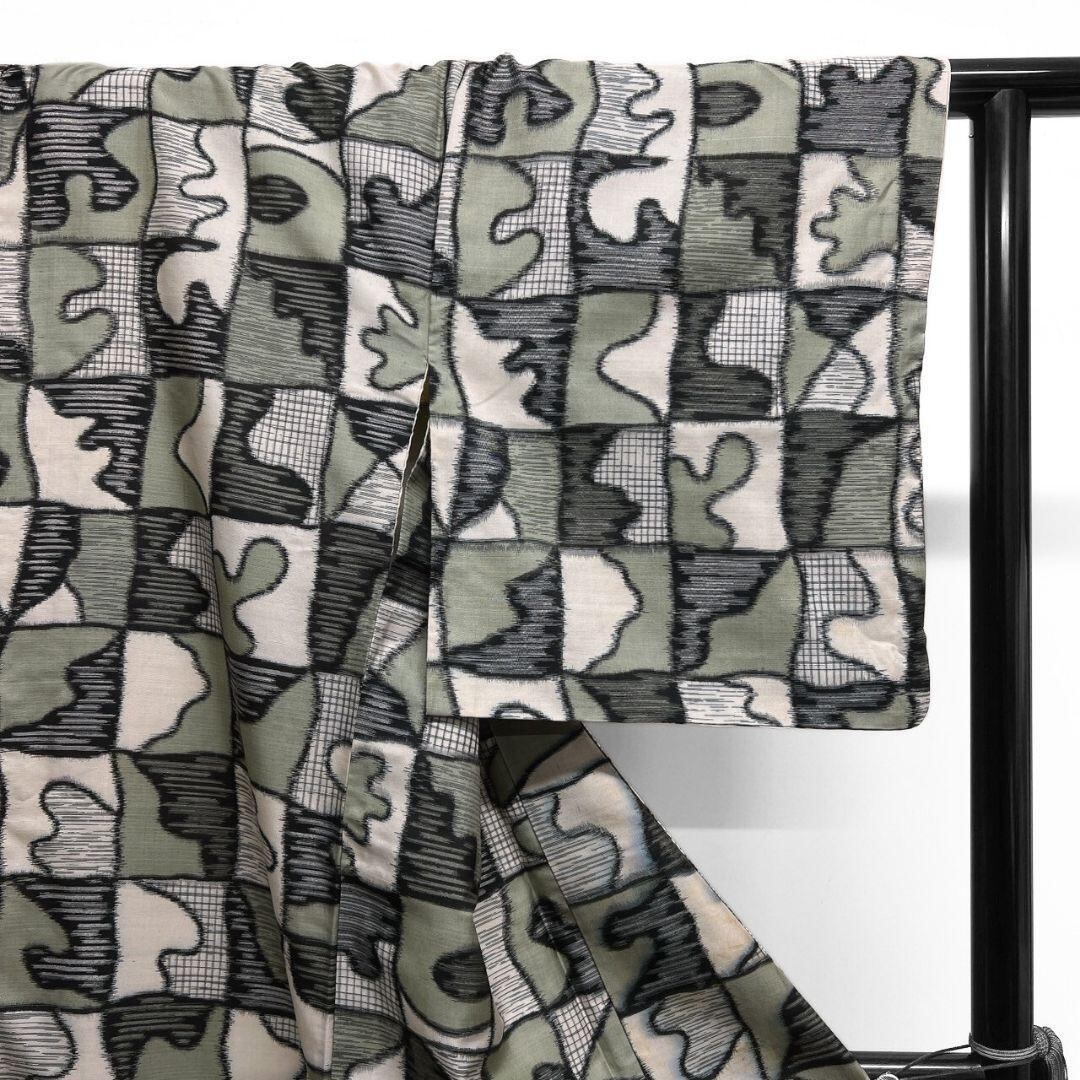 変わり市松模様に格子やランダムな流線が織り出された幾何学的なデザインの1着です。