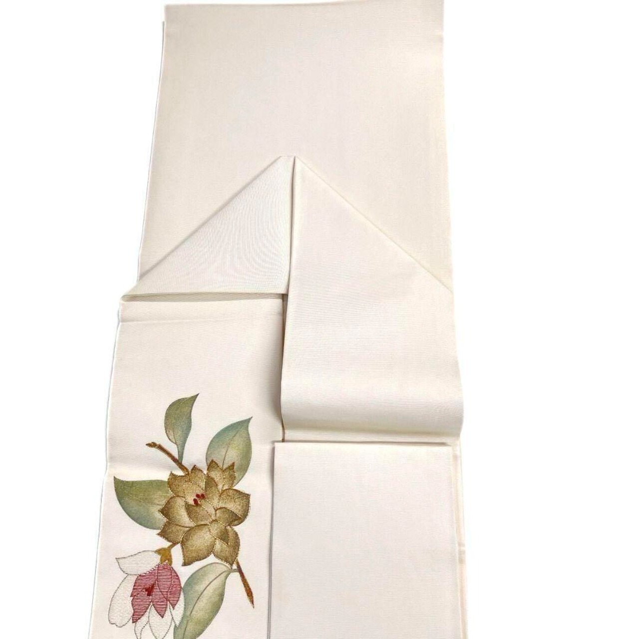 刺繍や金駒刺繍があしらわれた花模様の名古屋帯です。