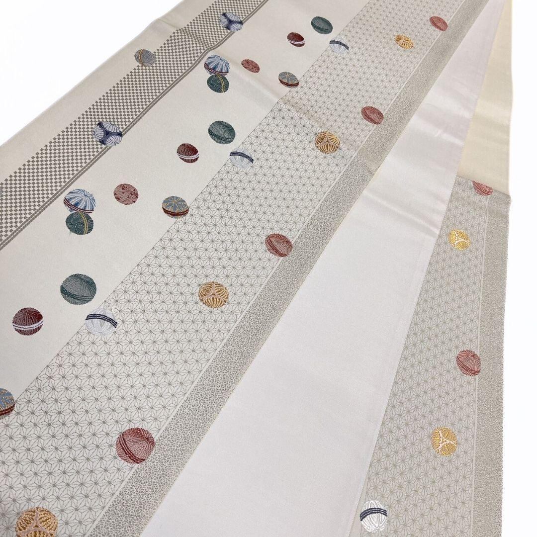 落ち着いたくすみオリーブカラーに金糸を交え織り出されたカラフルな鞠模様が粋なデザインの1着です。