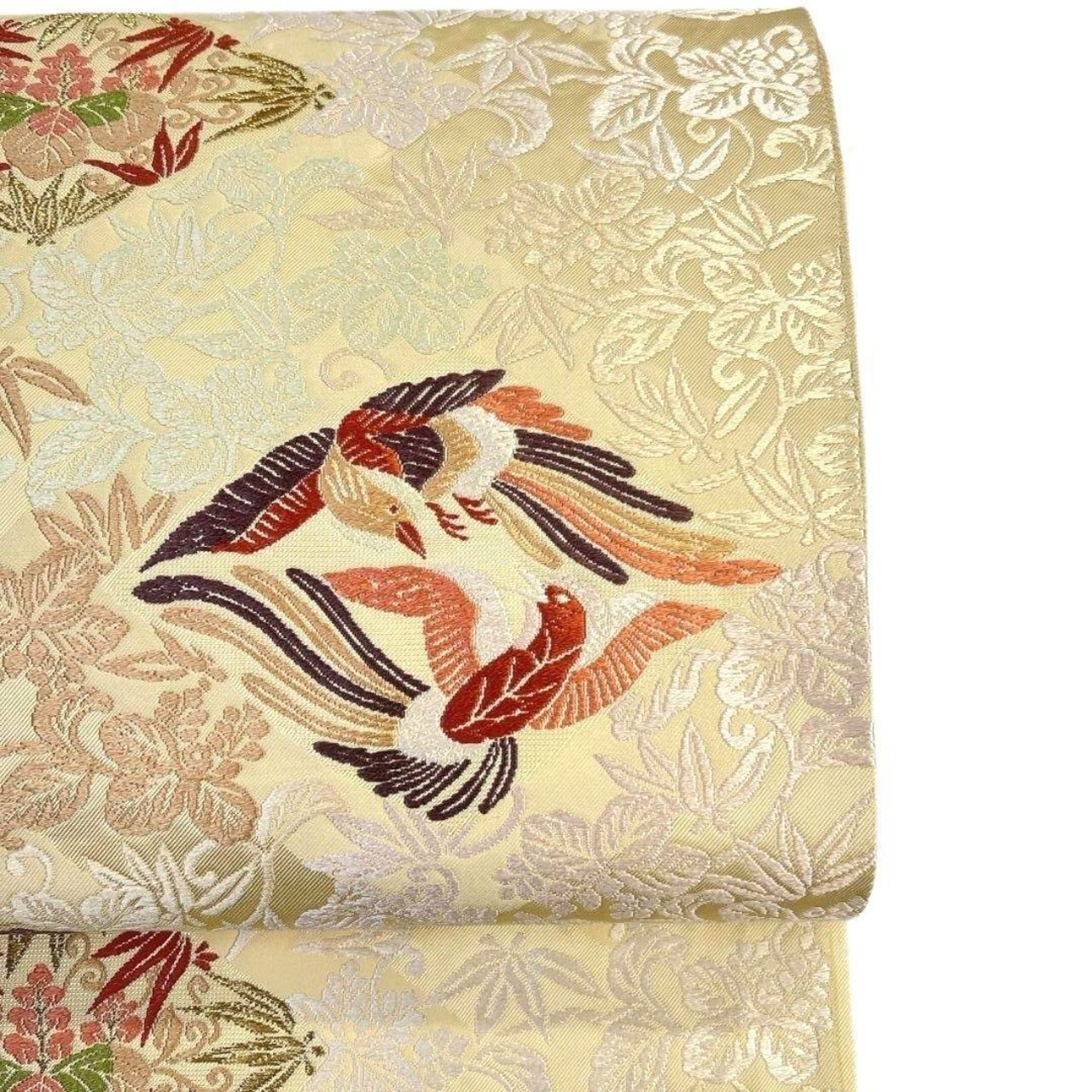 花菱や鳥紋が大ぶりに全体に織り出された袋帯です。