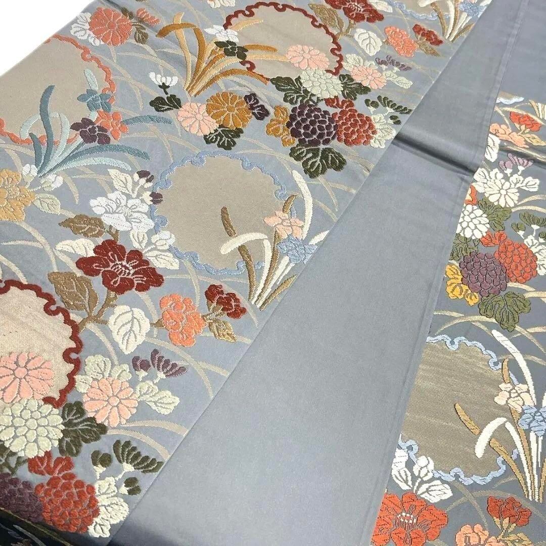 唐織で雪輪や菖蒲、菊花、椿、芝草が織り出された袋帯です。
