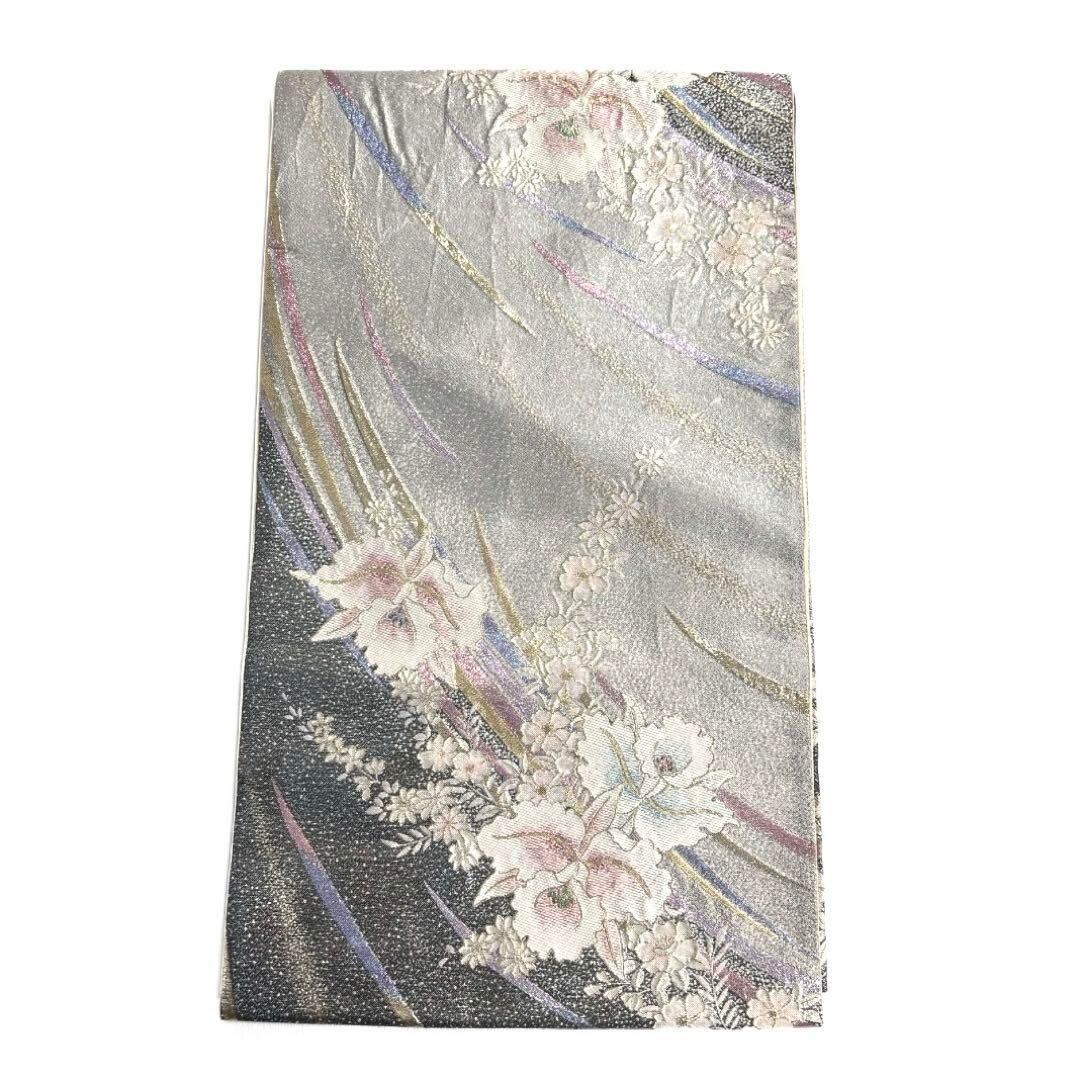 光沢のある濃淡のあるグレー地に斜めの流線模様と花模様が織られた華やかなデザインの一着です。