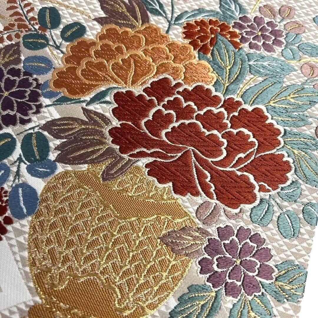 唐織で鱗模様や牡丹、藤などの花模様が織り出された袋帯です。