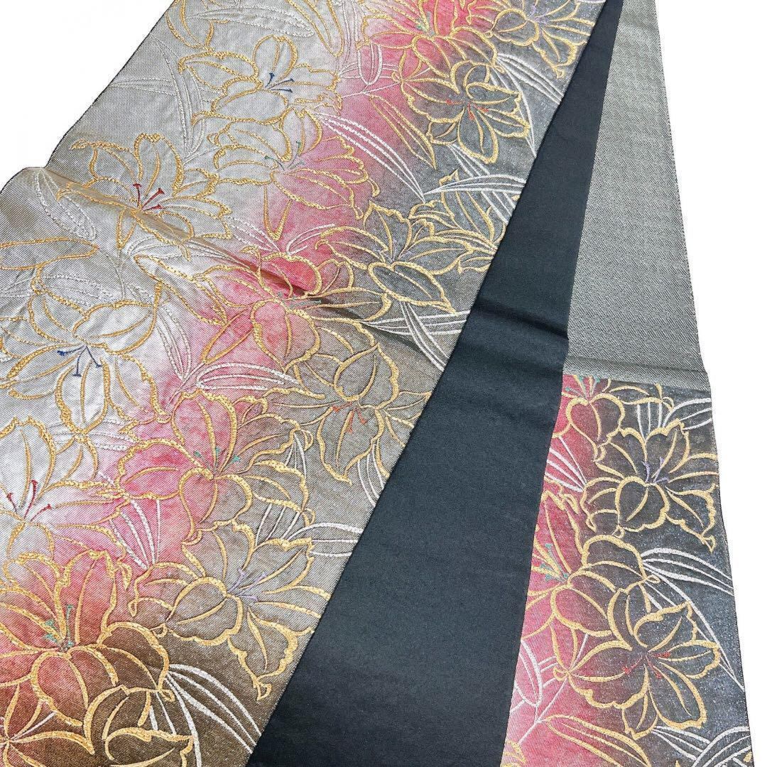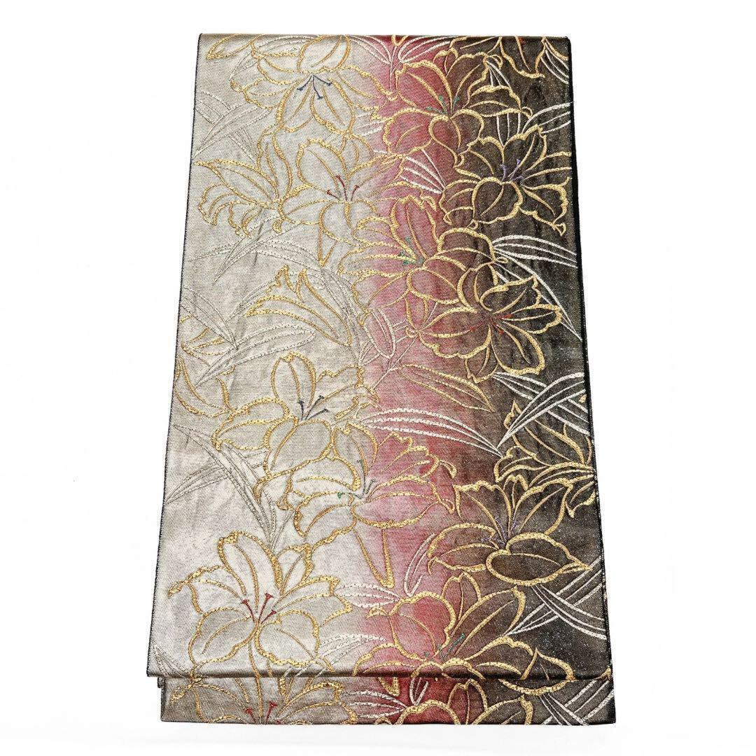 黒、ピンク、シルバーのグラデーションと金色に織り出された百合模様が華やかな1着です。
