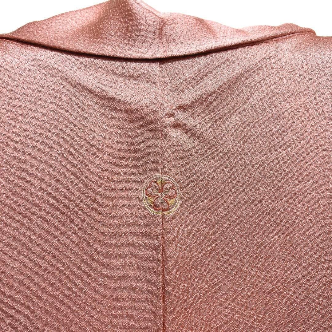 紗綾形地紋にくすみのあるピンクの地に金彩を交えた雪輪紋に様々な花模様と枝垂れ桜の文様が華やかなデザインの一着です。
