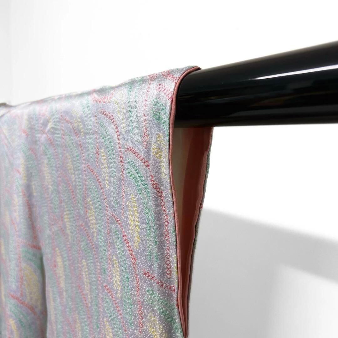 少し紫のかかった薄いグレーの地にレッド、イエロー、グリーンの総絞りで描かれた変わり青海波の文様がお洒落な雰囲気の一着です。