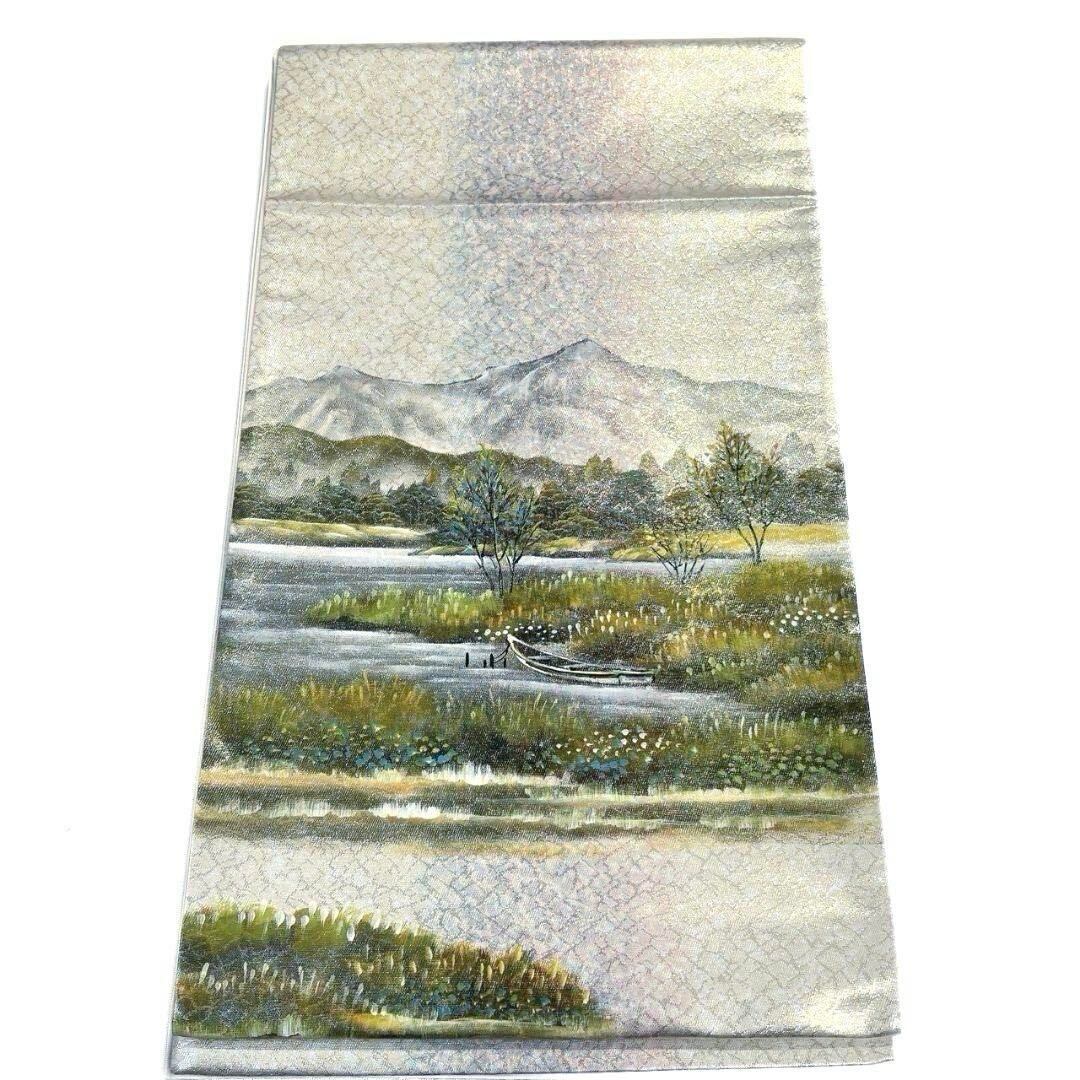 作家ものの山景に川辺や渡舟が描かれた袋帯です。