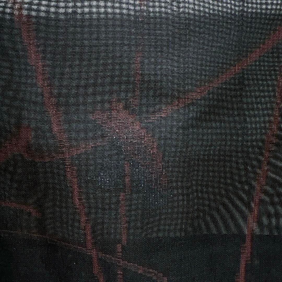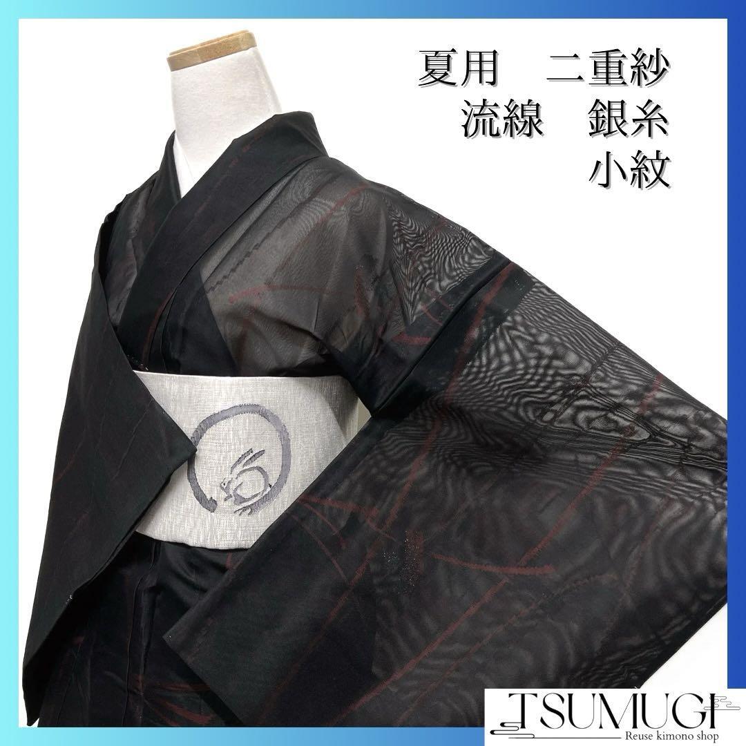 表の黒地と裏地の深い赤地の二重紗に織られた流線模様と銀糸を交えた抽象模様がお洒落なデザインの一着です。