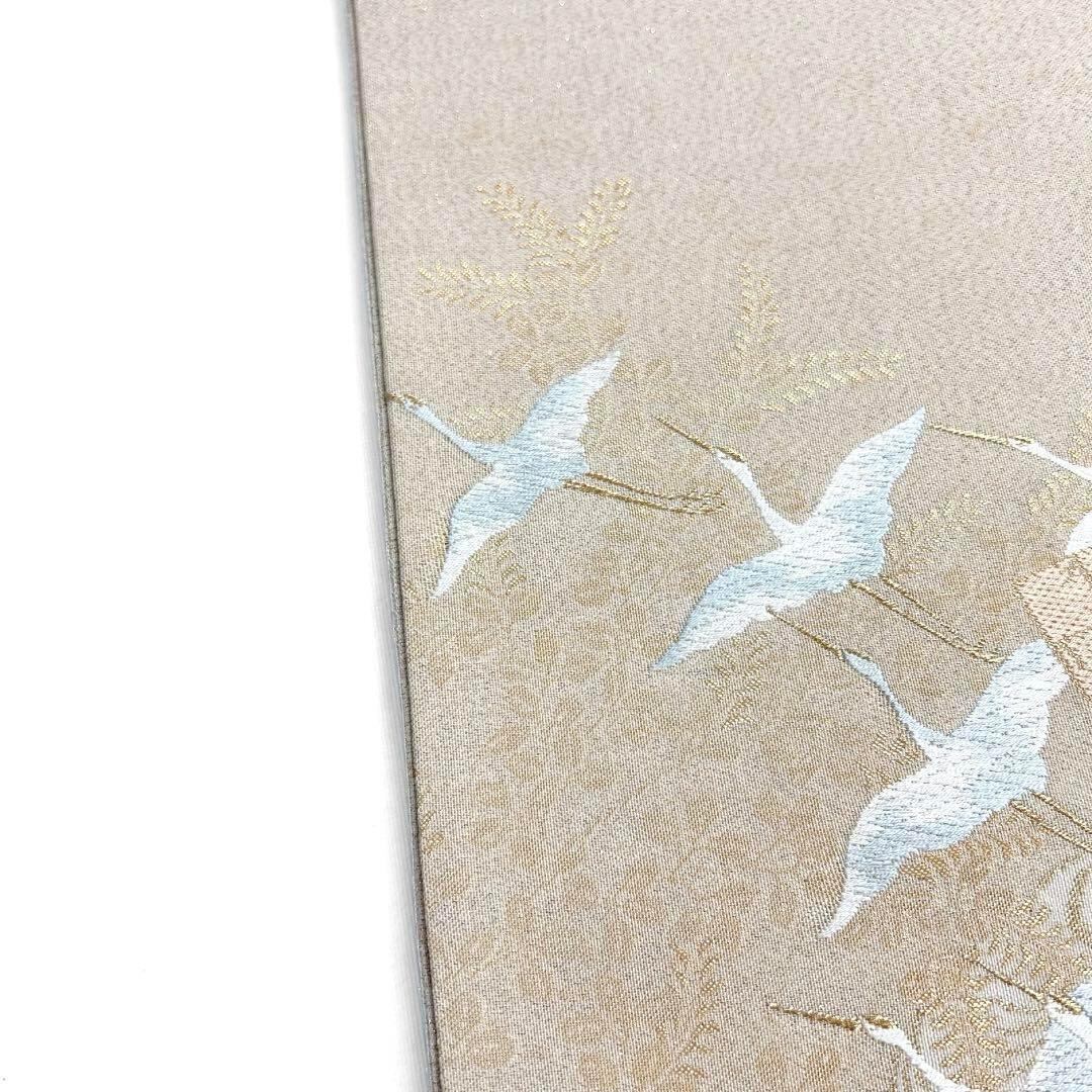 綴れ織の金通しのベージュ地に鶴に色紙重ねと色紙に様々な文様が織られた華やかなデザインの一着です。