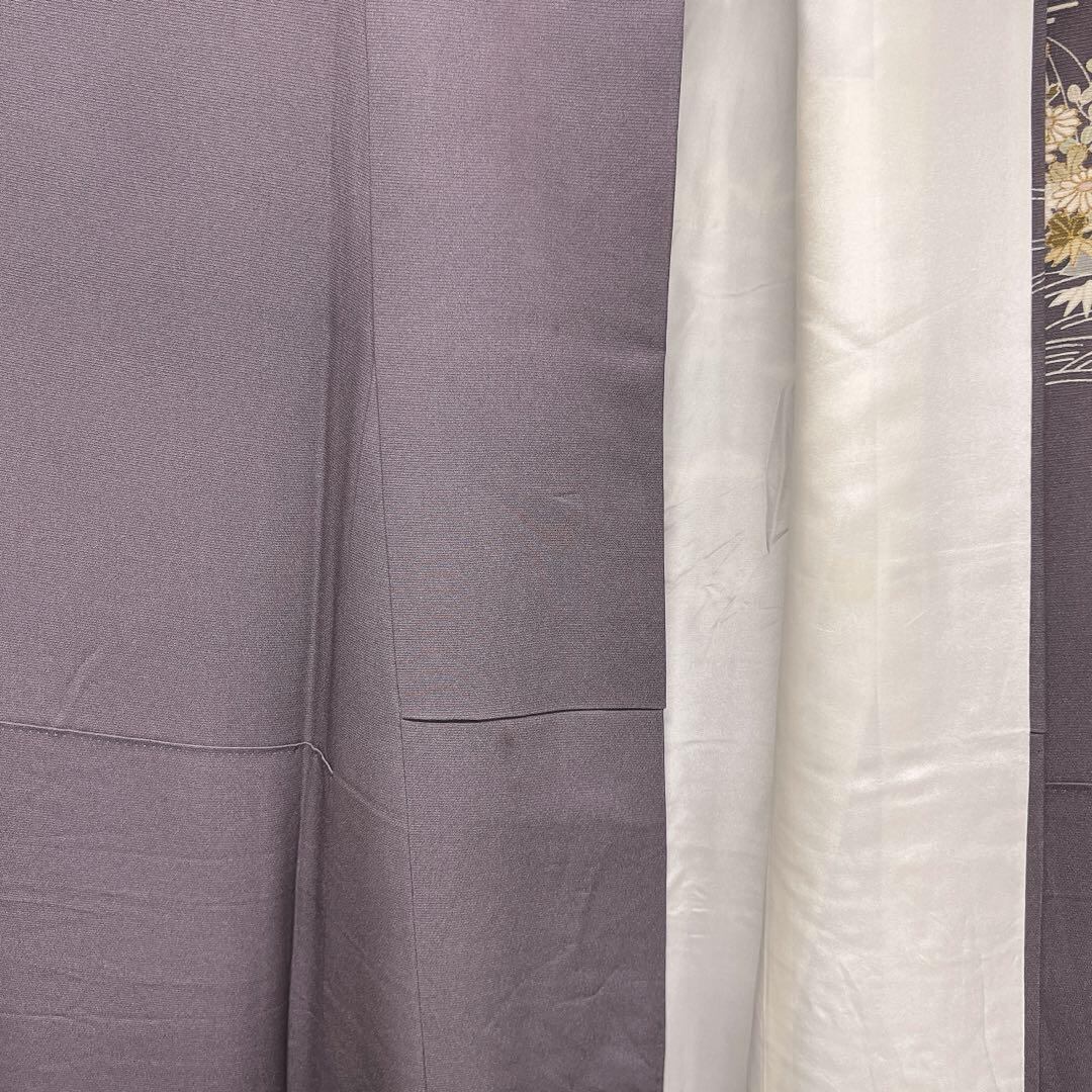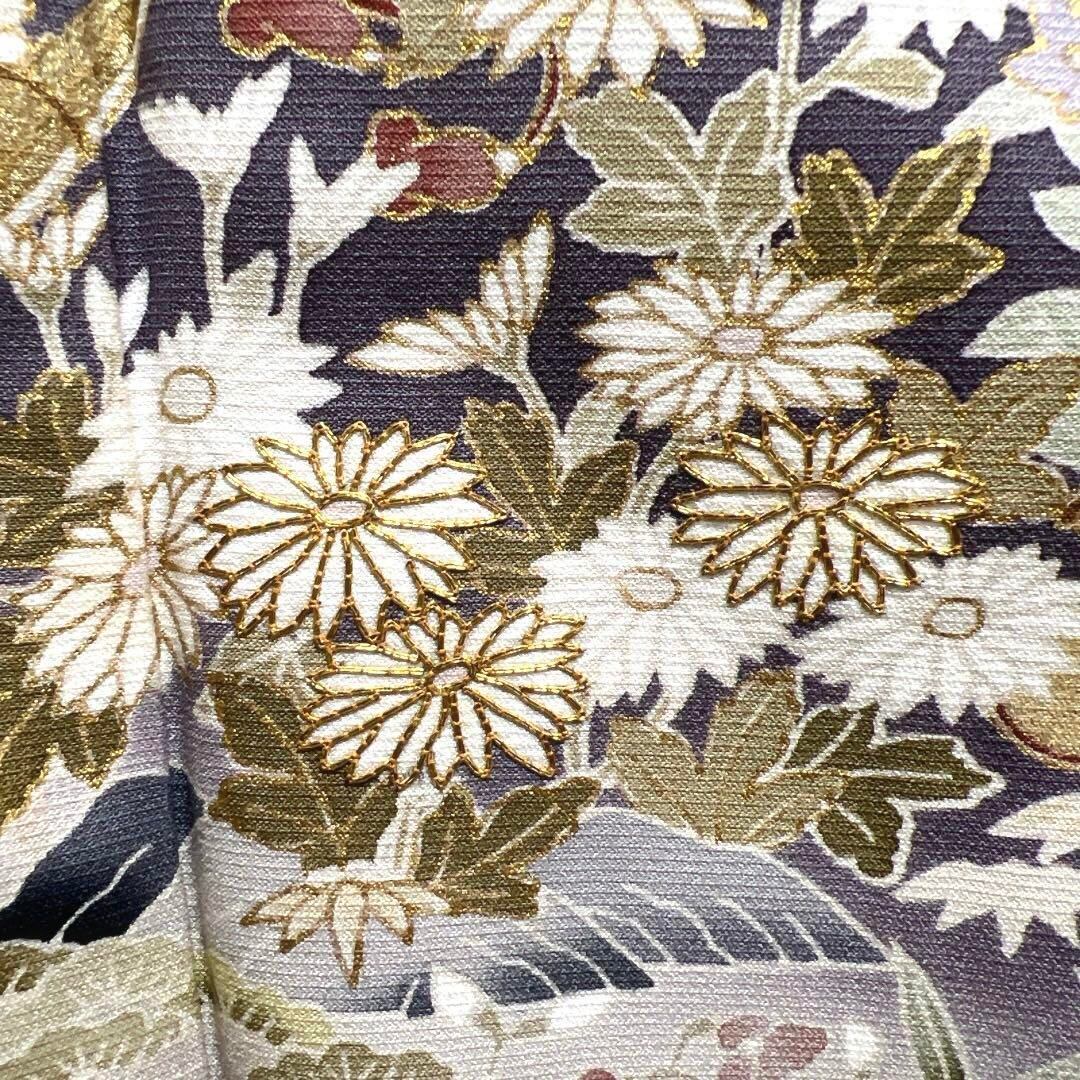 くすみの深いパープルの地に映える金駒刺繍の菊花と金彩を交えて描かれた楽器に様々な花模様や霞に波が描かれた華やかなデザインの一着です。