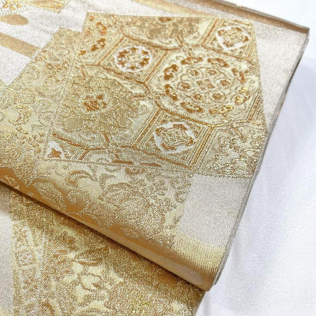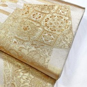 光沢のあるオフホワイト地にヱ霞模様と色紙模様に蜀江紋や唐草花や波模様などが織られた華やかで絢爛な一着です。