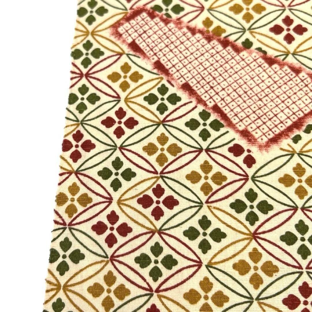オフホワイトの紬地にカラフルな七宝と幾何学模様に鹿の子が描かれたお洒落なデザインの一着です。