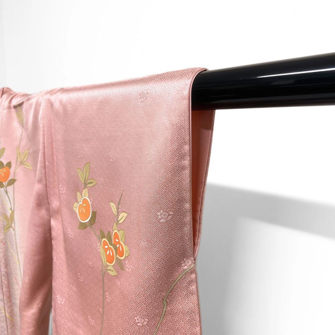 紗綾形地紋のピンクの地にぼかし染めとたたき染に斜め縞の文様と金彩で縁取られた橘の文様が華やかなデザインの一着です。