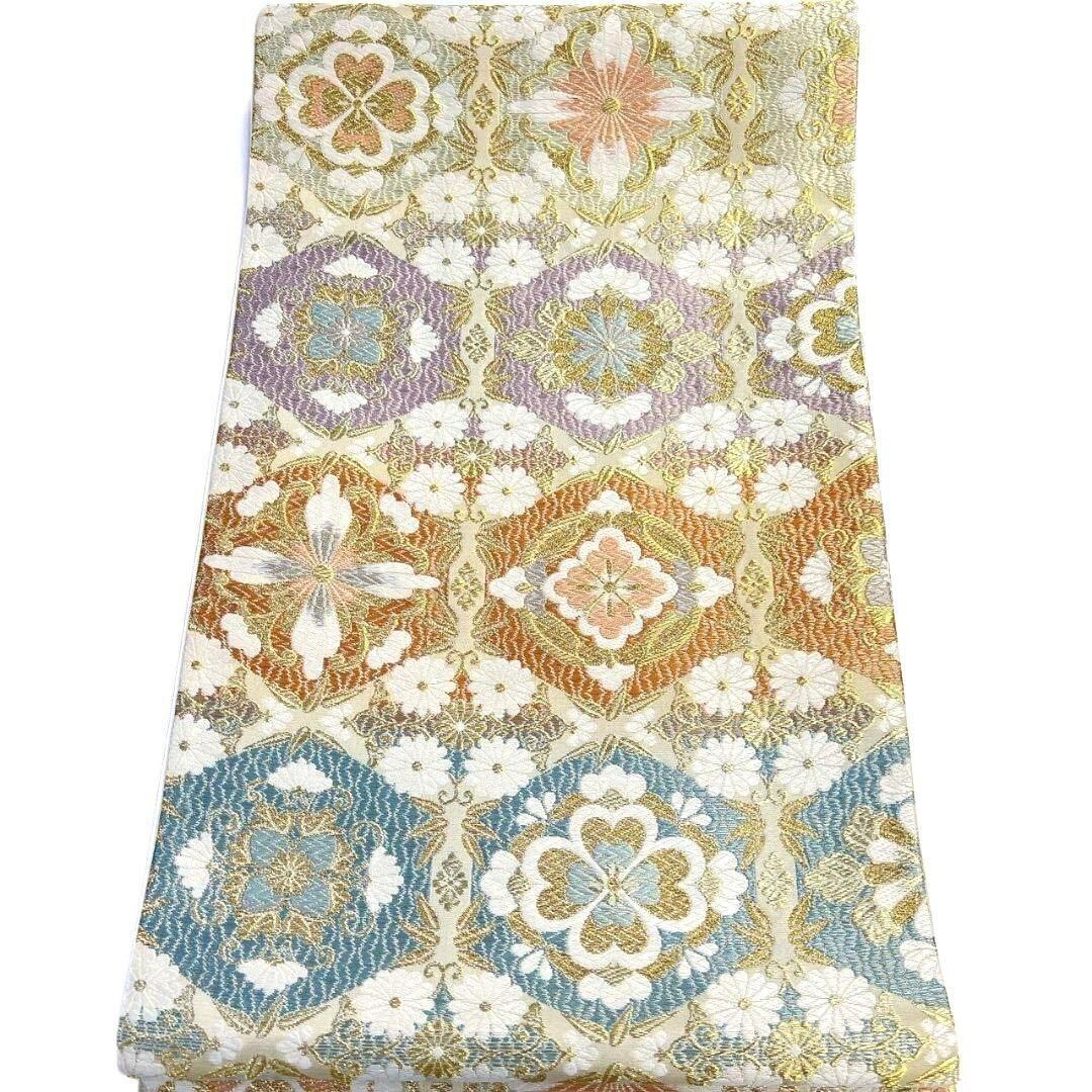 亀甲に花菱や菊花紋が織り出された袋帯です。