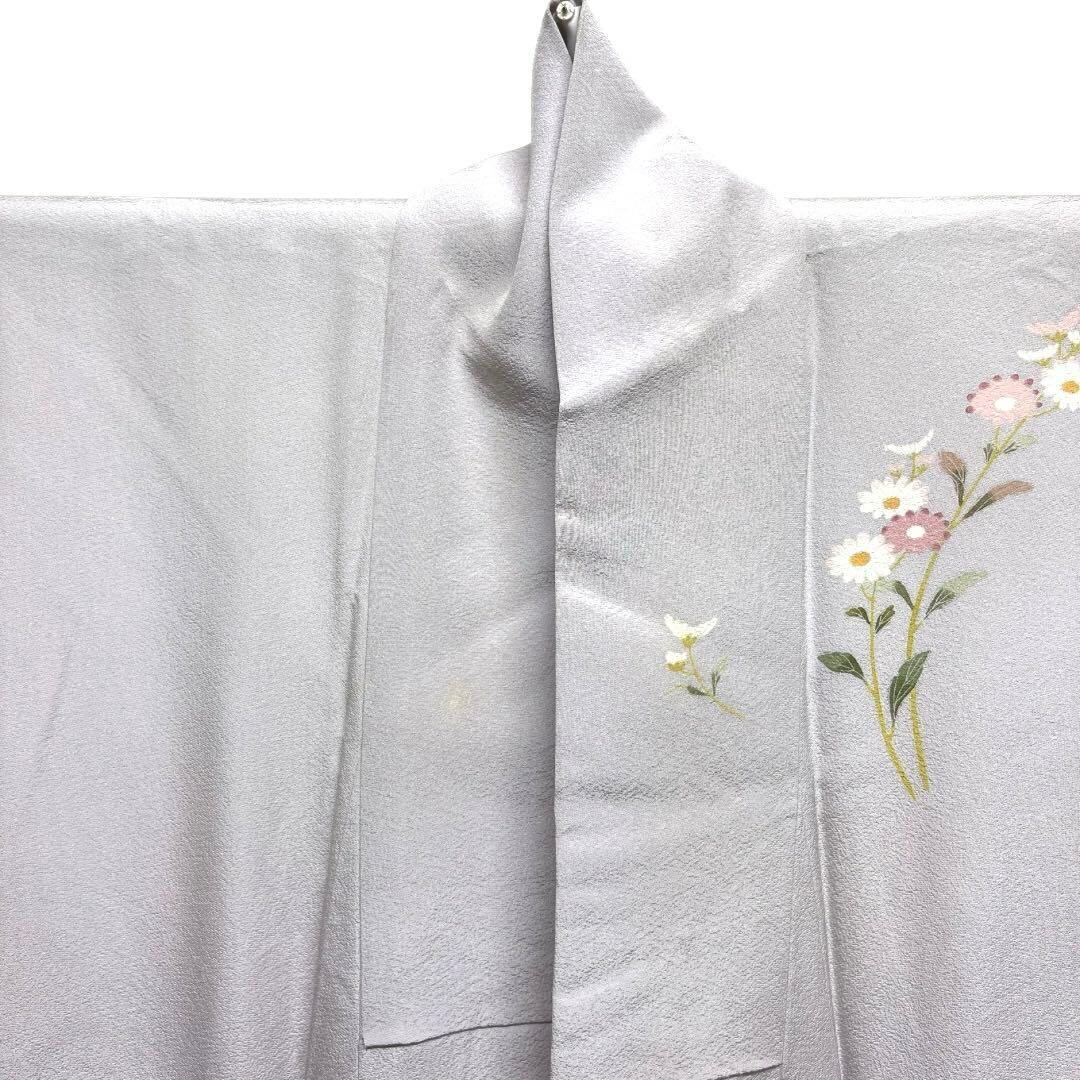 くすみのあるアイリスカラーの地にグラデーションと菊や小花の花模様が描かれた華やかなデザインの一着です。