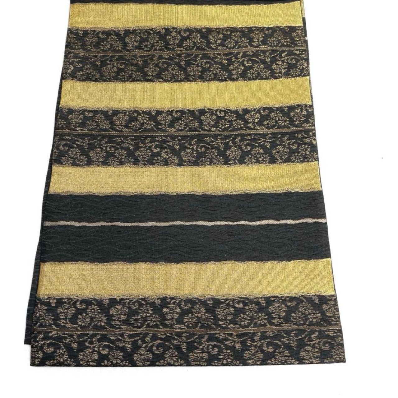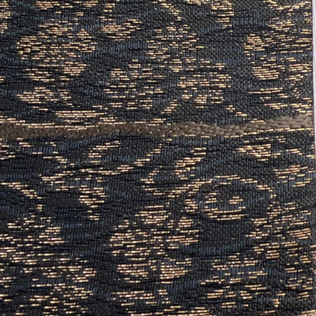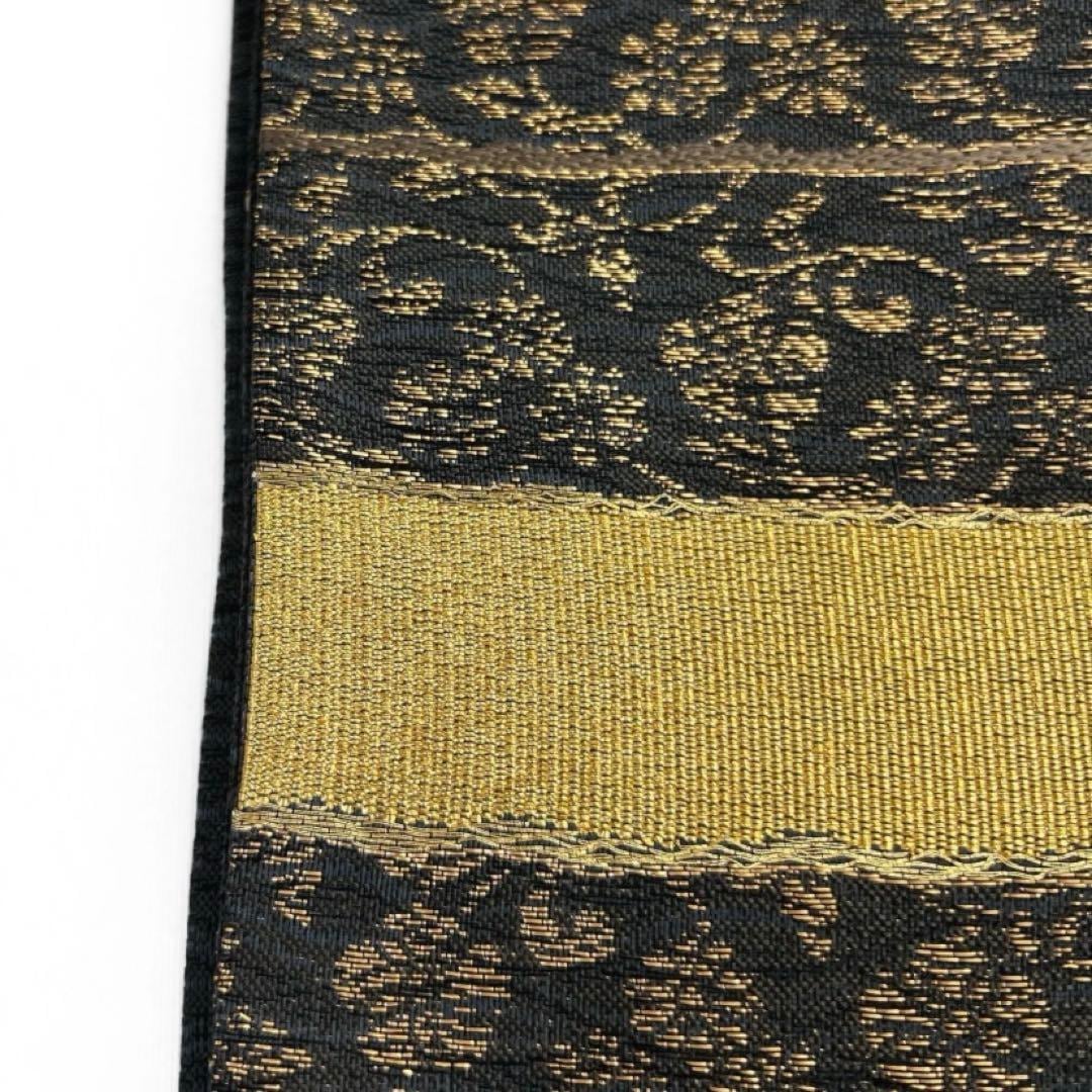黒地にゴールドの横縞と唐草に花模様が織られた華やかなデザインの一着です。