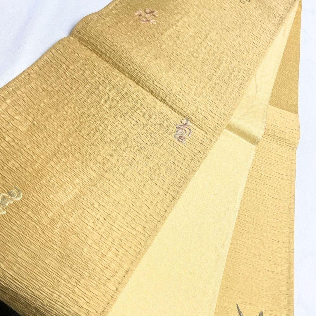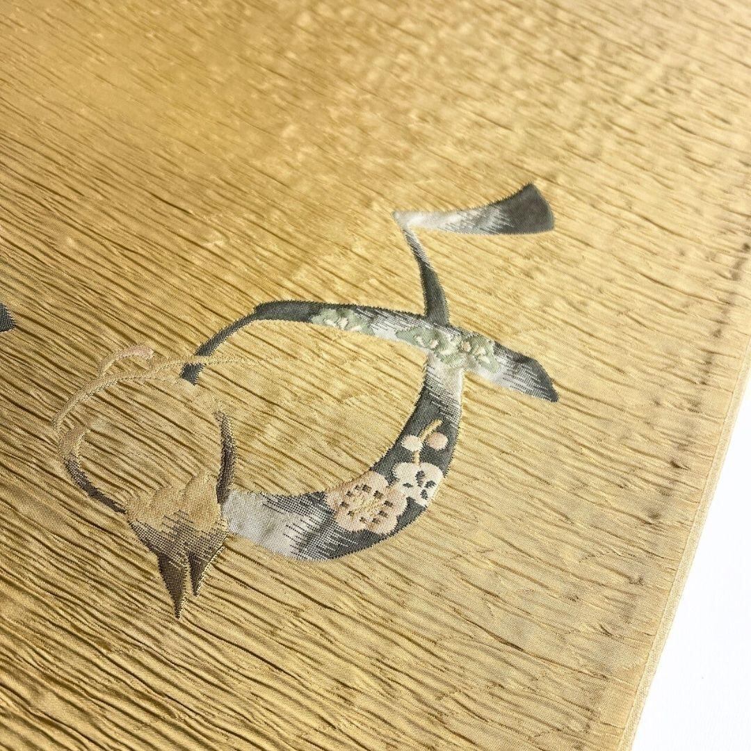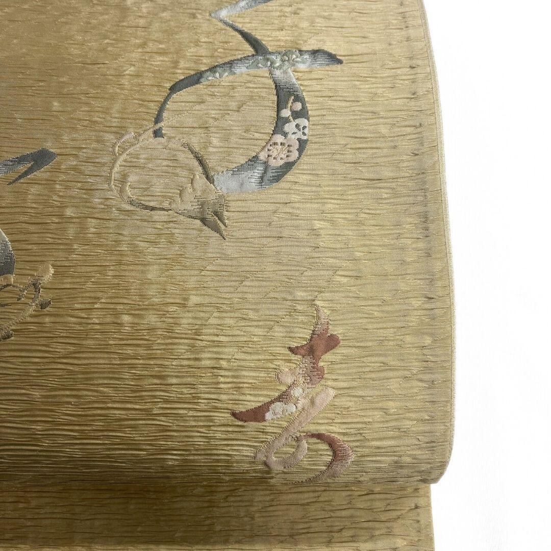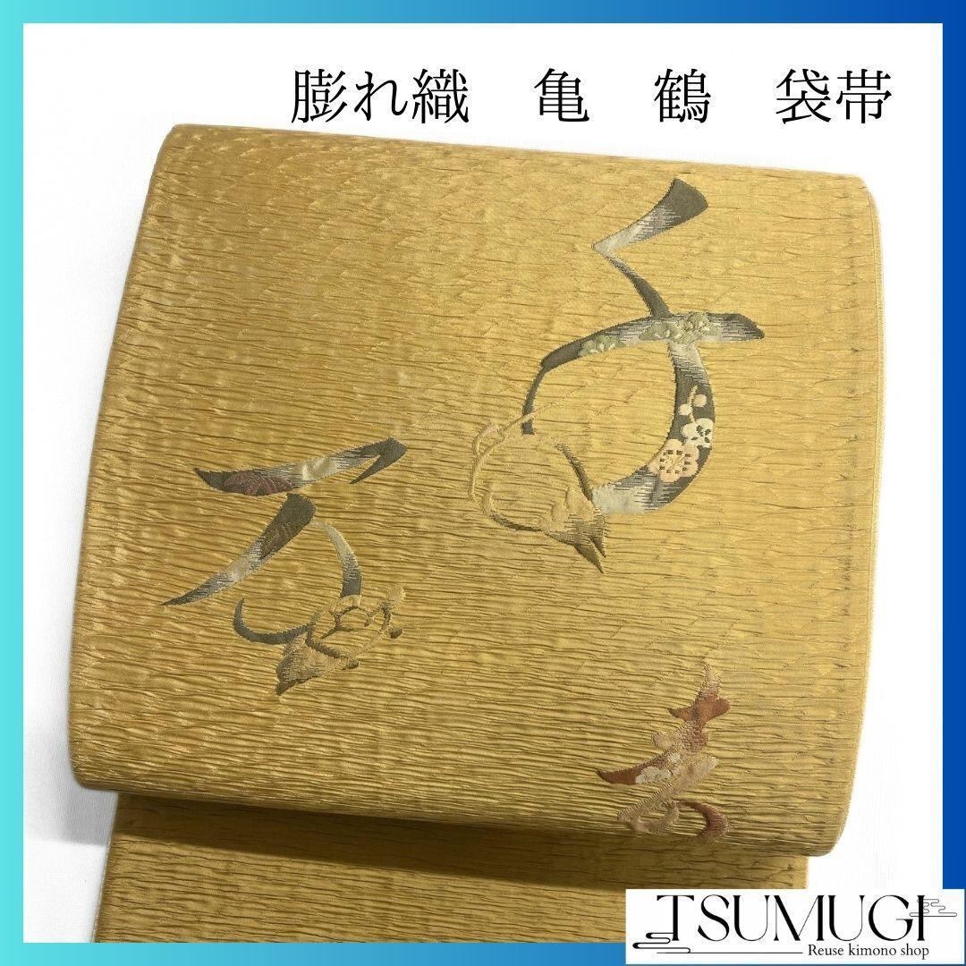 膨れ織りで千万寿、亀、鶴が織り出された袋帯です。