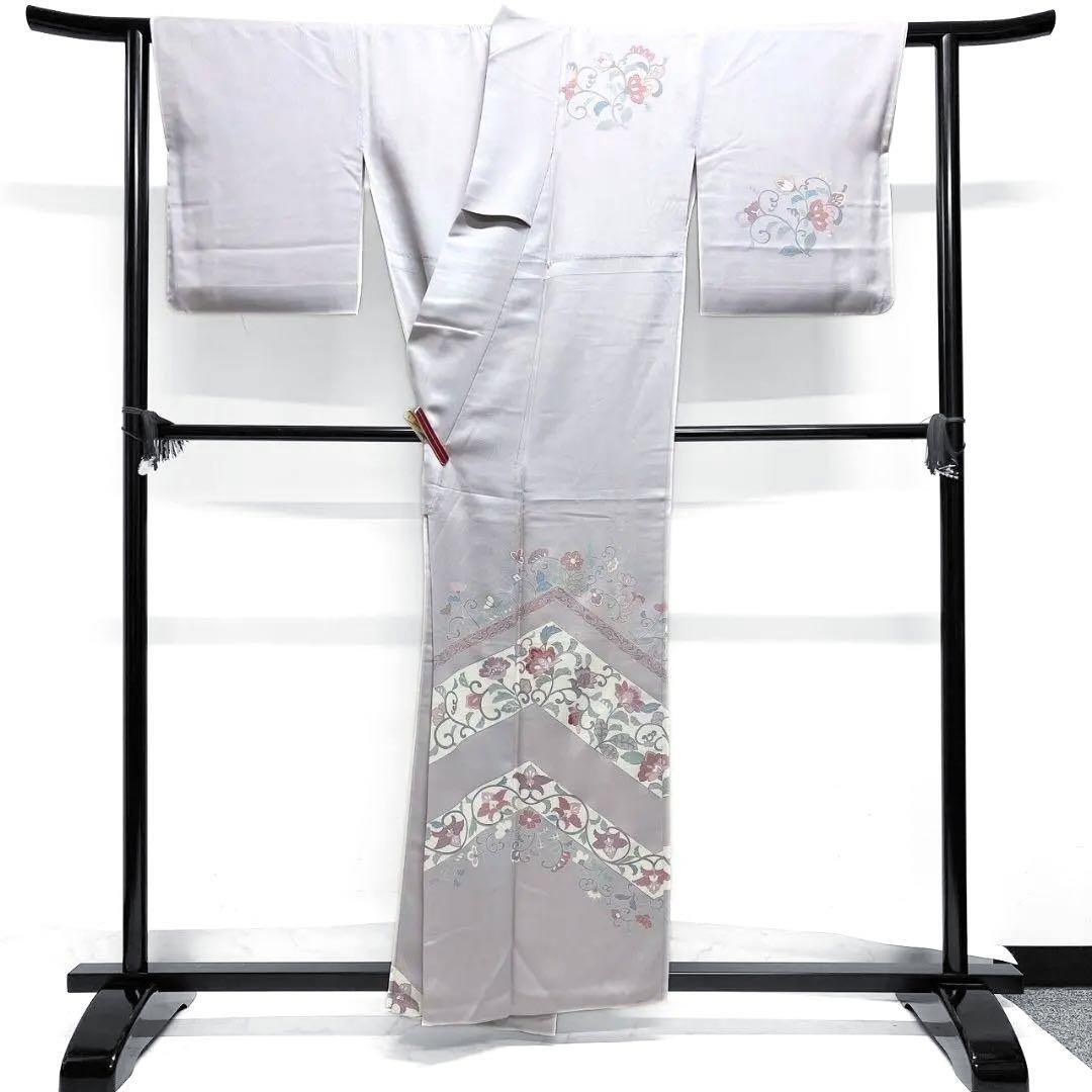 刺繍があしらわれた唐花模様と薄ピンクの付け下げです。