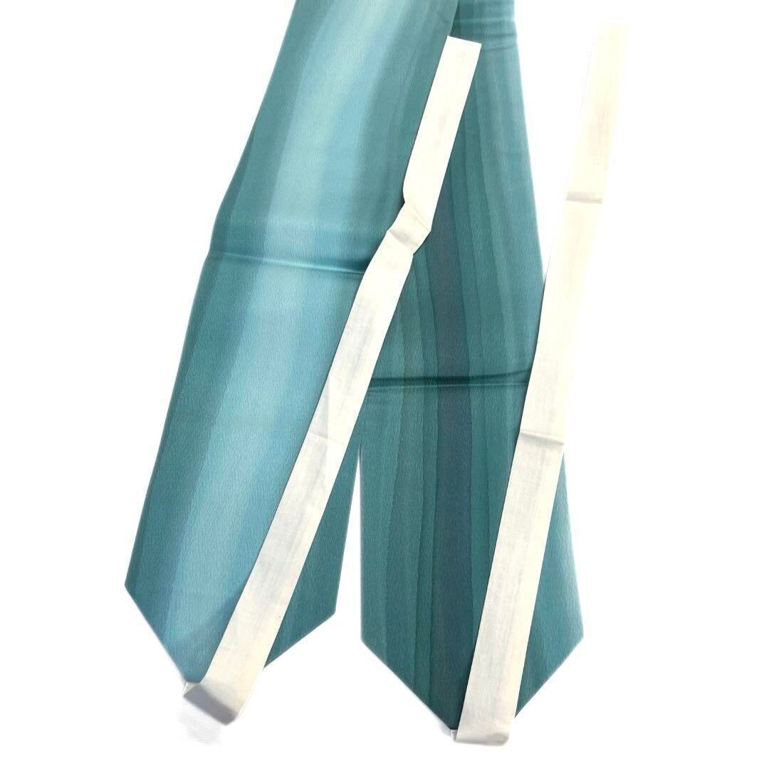 青緑のグラデーションによろけ縦縞の文様がお洒落なデザインの一着です。