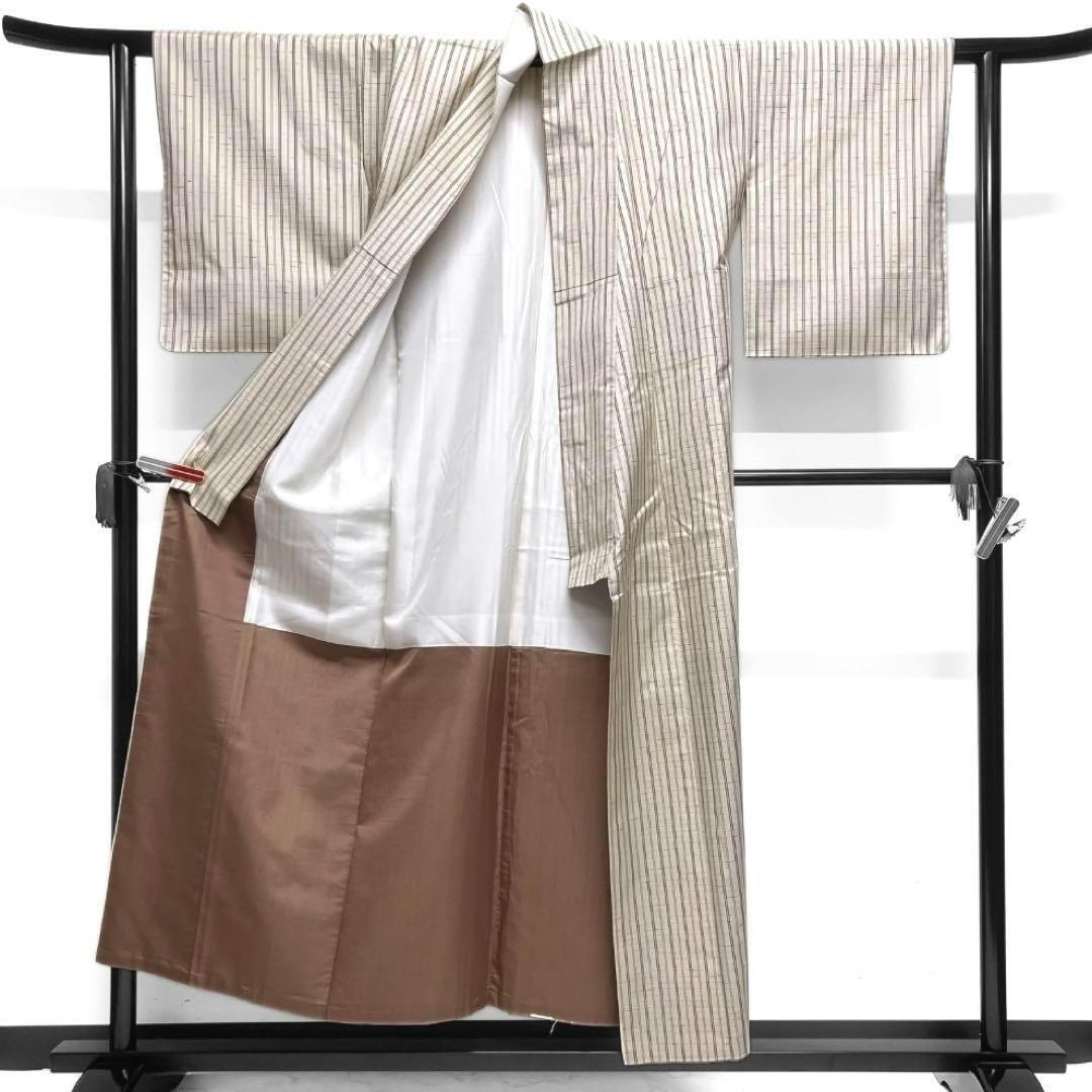 ぜんまい紬の薄いベージュ地に縦縞模様が織られたお洒落な一着です。