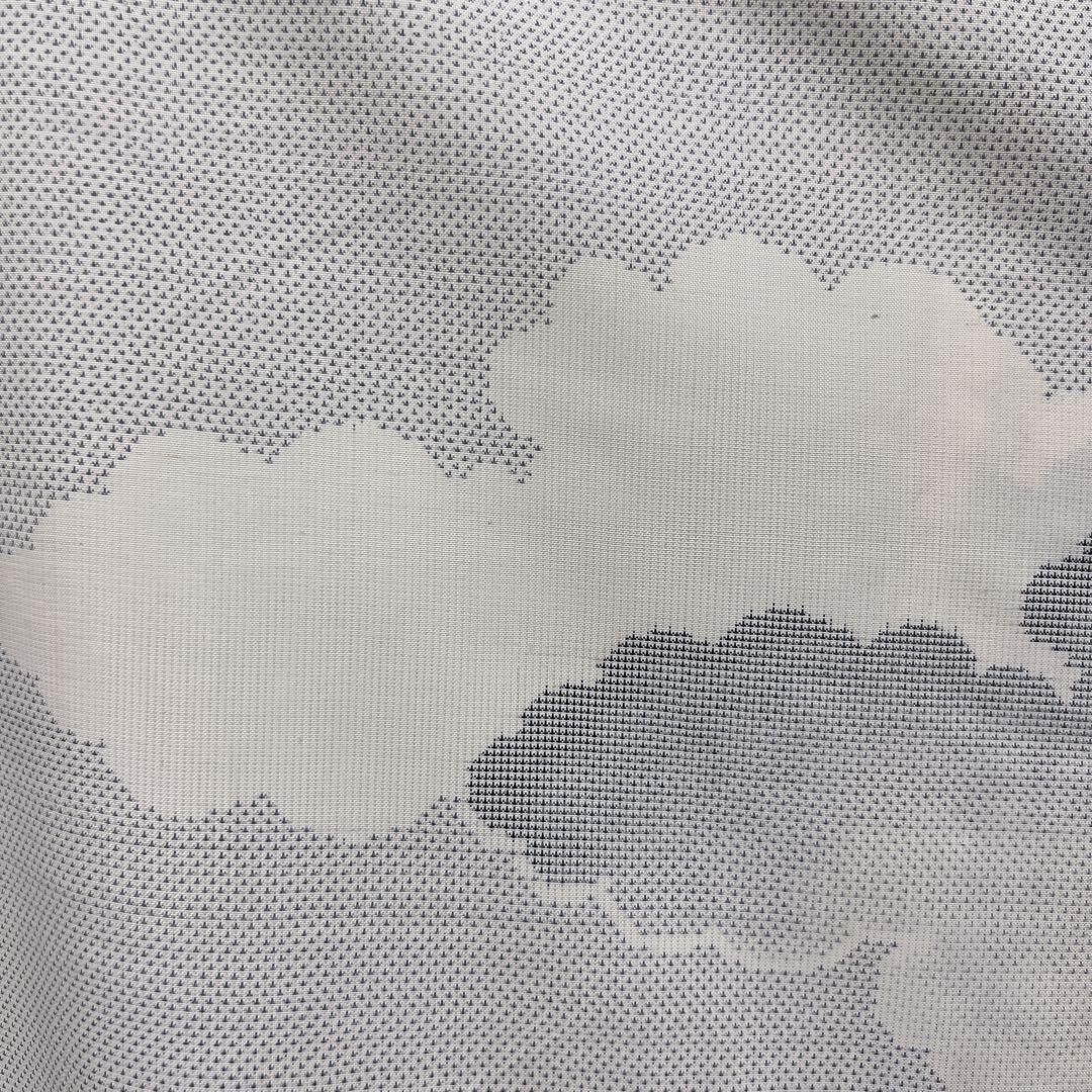 白地の大島紬地に織られたグラデーションの雲の文様がお洒落なデザインの一着です。