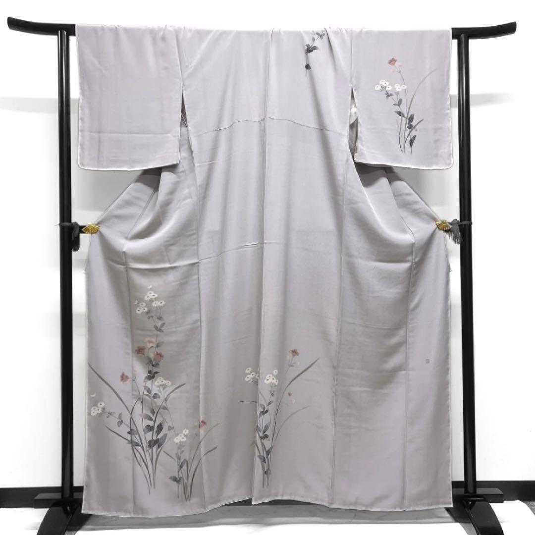 くすみカラーの薄いパープル地に京加賀友禅で描かれた花模様が華やかな一着です。