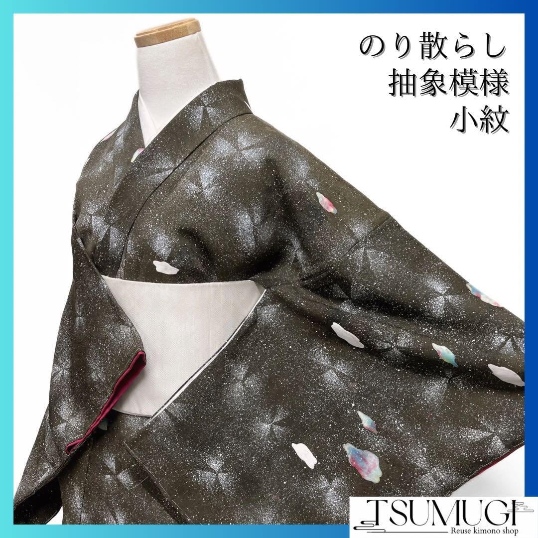 カーキグリーンのグラデーションの地に白ののり散らしで描かれた抽象模様とぼかし染めの雲の文様がお洒落なデザインの一着です。