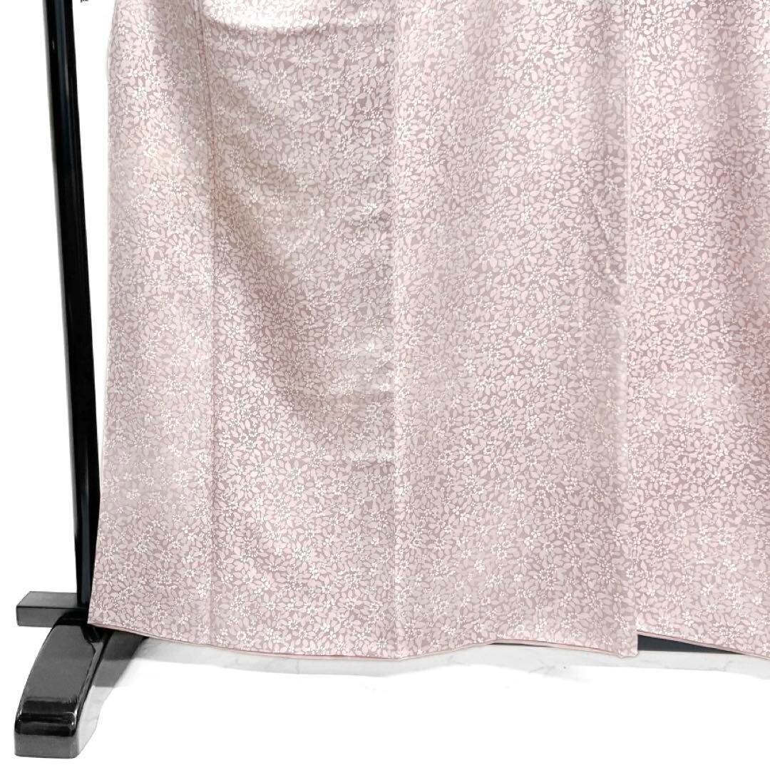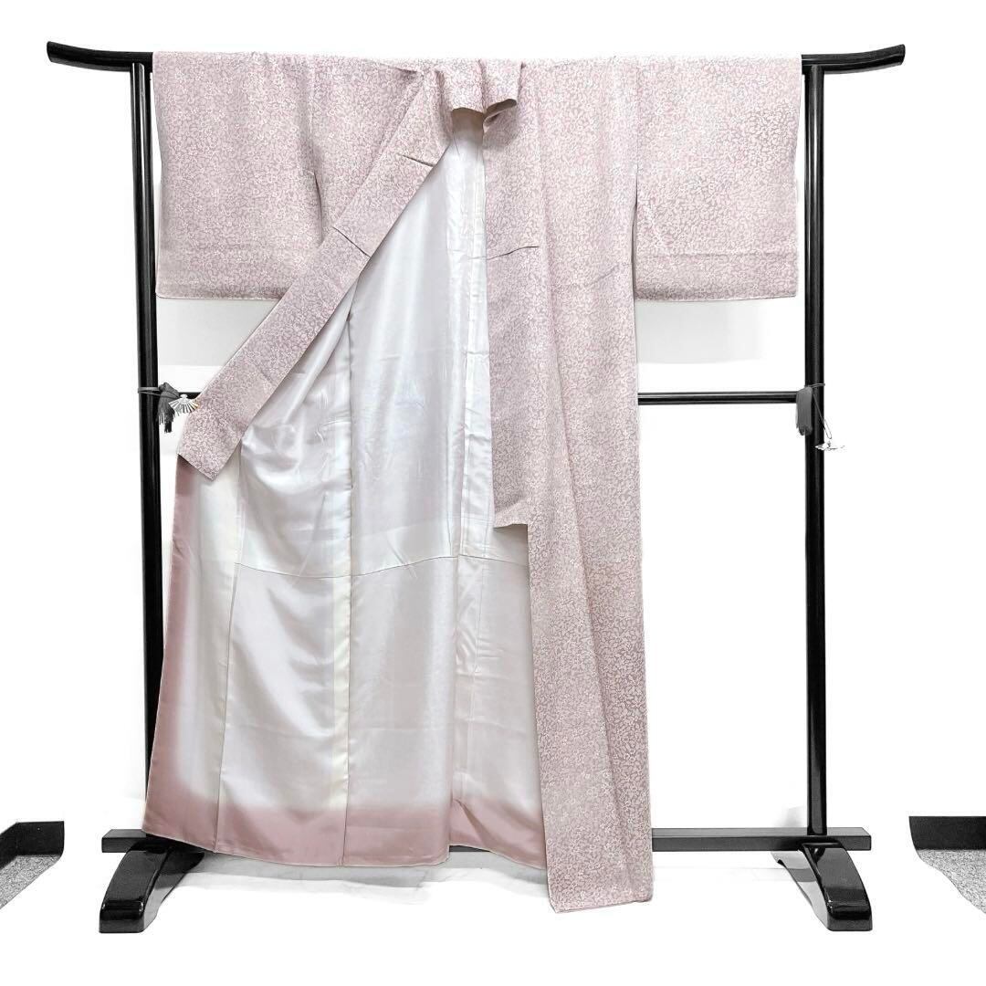 くすみの薄いパープルの地に淡く細やかに描かれたリーフに花模様がお洒落なデザインの一着です。