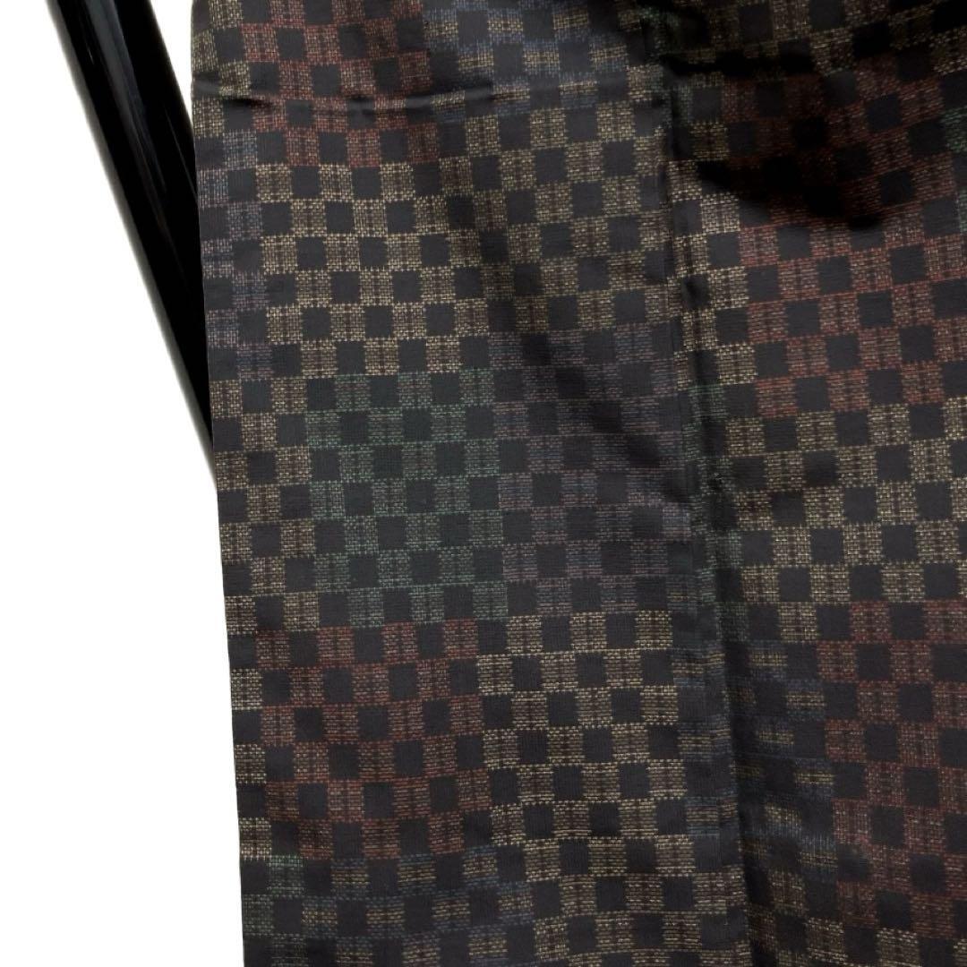 大島紬の地にカラフルに織られた横縞と変わり市松の文様がお洒落なデザインの一着です。