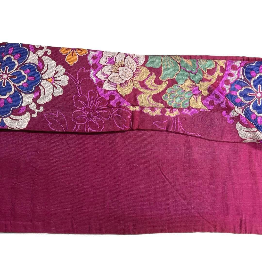 紫の強いワインレッド地に織られた大ぶりの唐花模様と華紋の文様が織られた華やかなデザインの一着です。