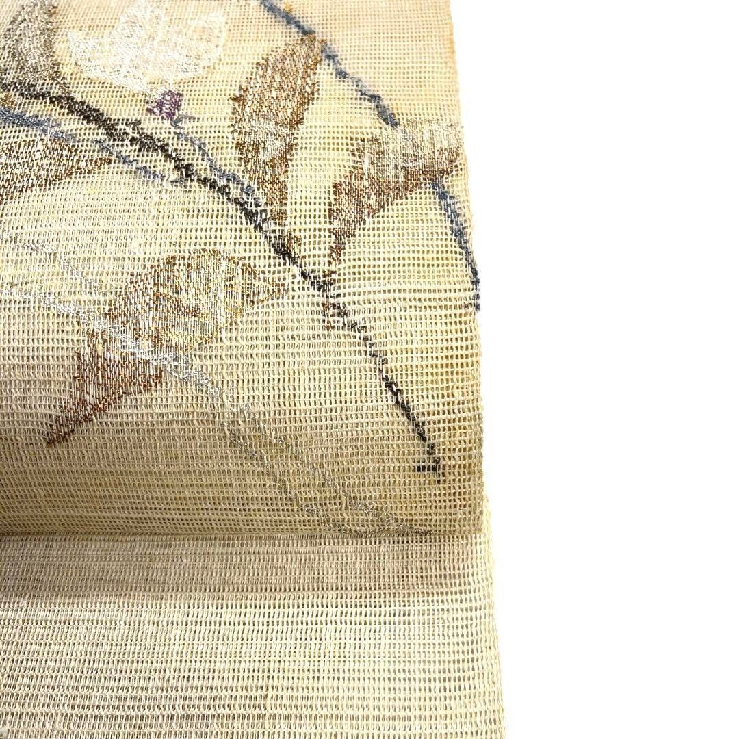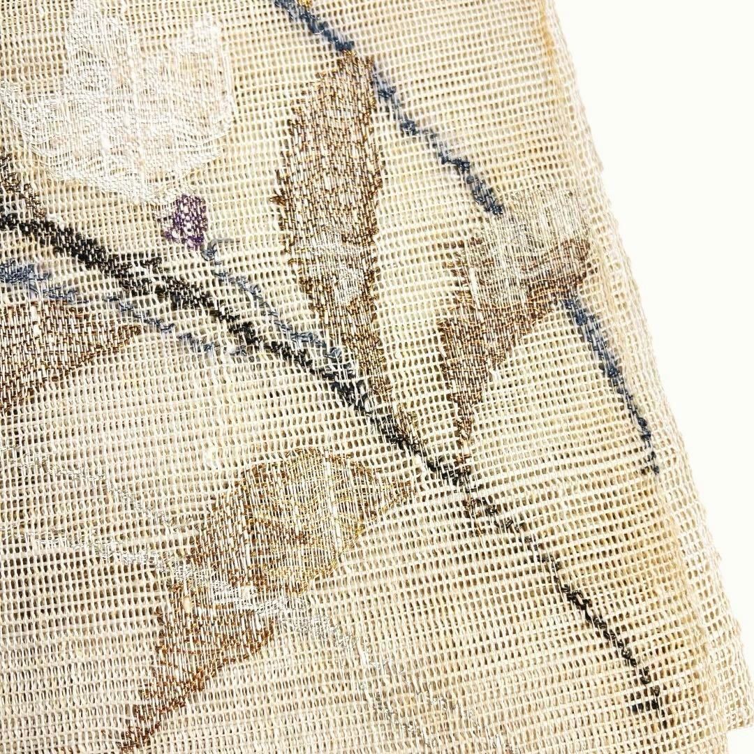オフホワイトの地に金糸と銀糸を交えて抽象的に織られた桔梗の文様がお洒落なデザインの一着です。