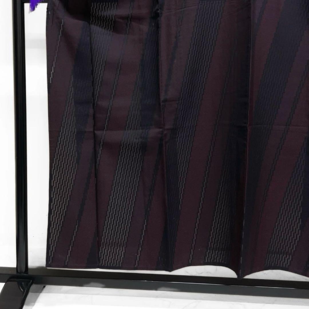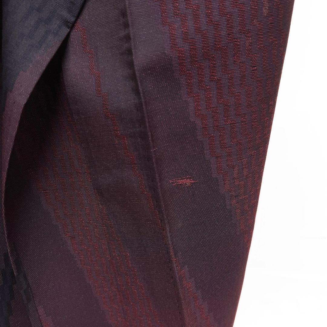 ダークトーンのワインレッドとパープルの斜め縞に紋紗の市松文様が織られたお洒落なデザインの一着です。