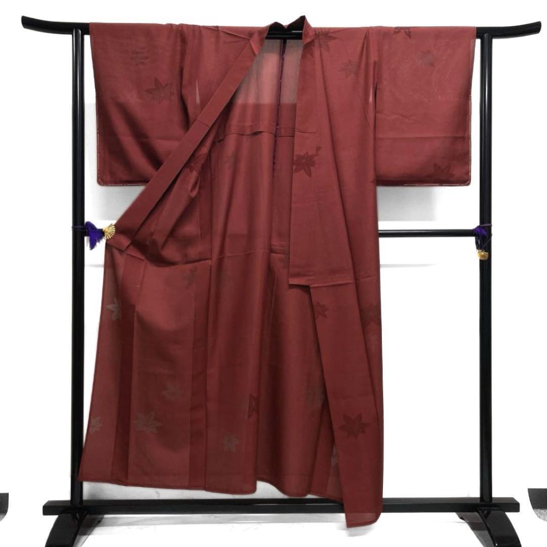 くすみの深いオレンジの縦絽地に楓の文様が織られたお洒落なデザインの一着です。