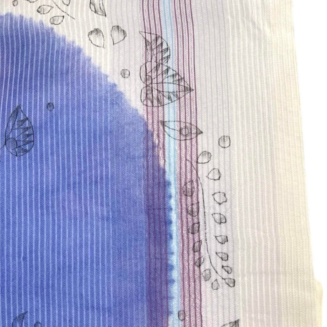 ホワイトの絽の地にパープルとライトブルーの縦縞に青紫の円弧と辻ヶ花の文様がお洒落なデザインの一着です。