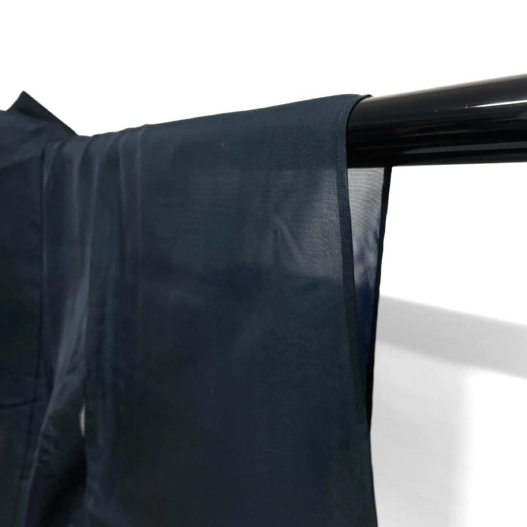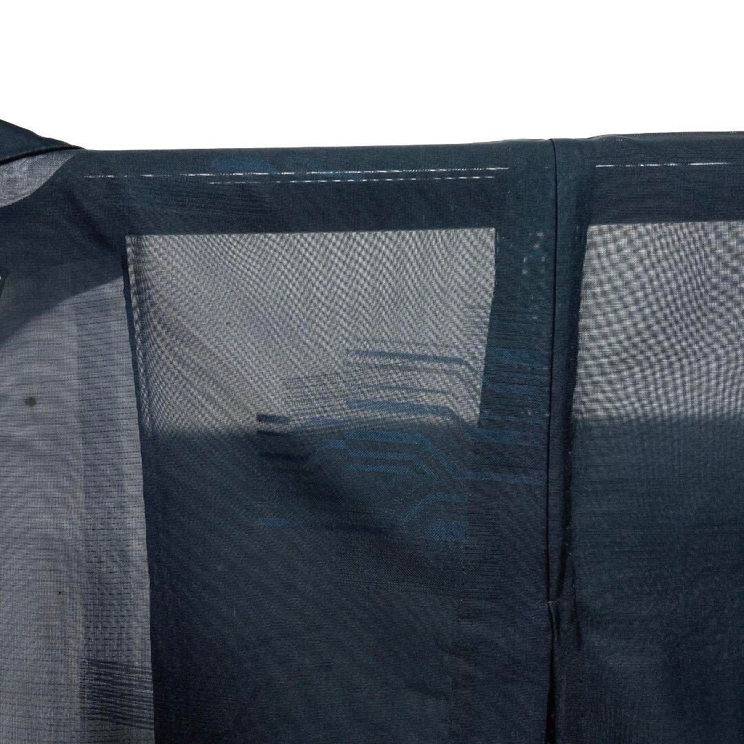 深いくすみのグリーンの表地にブルーの裏地による二重紗で織られた縞模様のような抽象模様がお洒落なデザインの一着です。