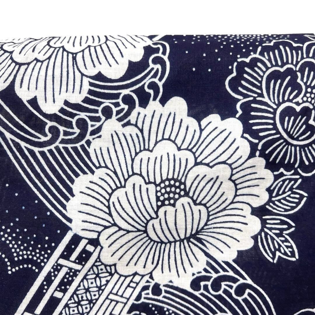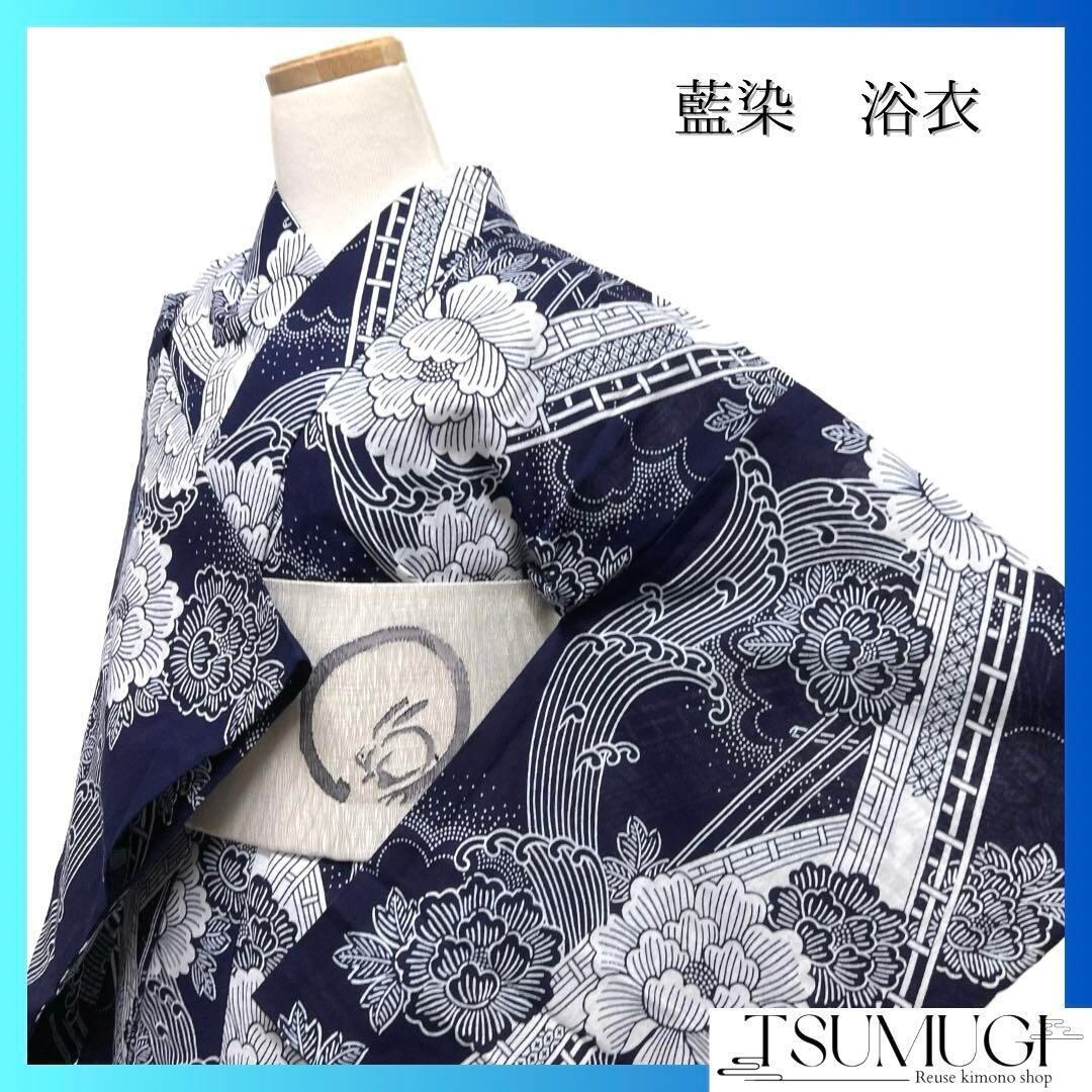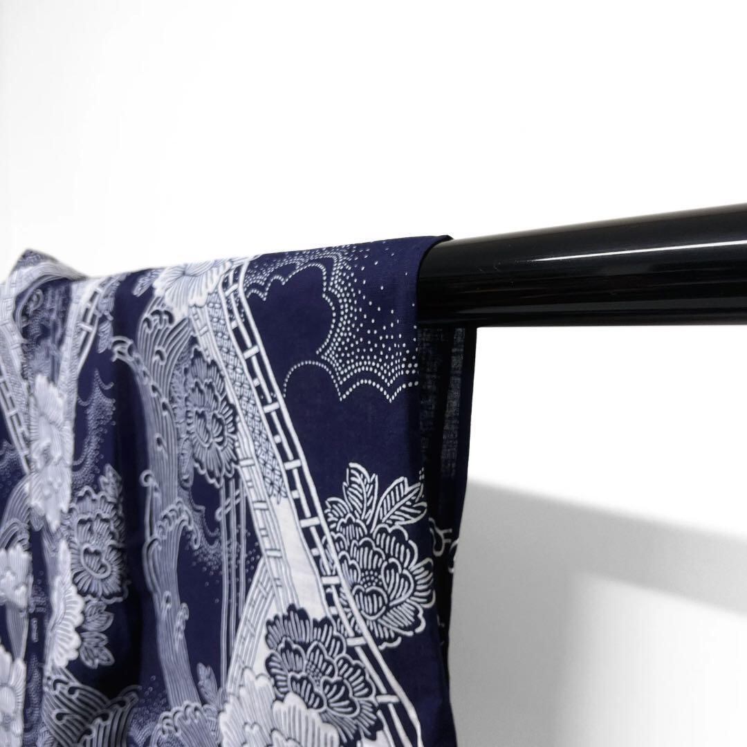 藍染のネイビーと白で縦に描かれた牡丹と八ツ橋、波の文様がお洒落なデザインの一着です。