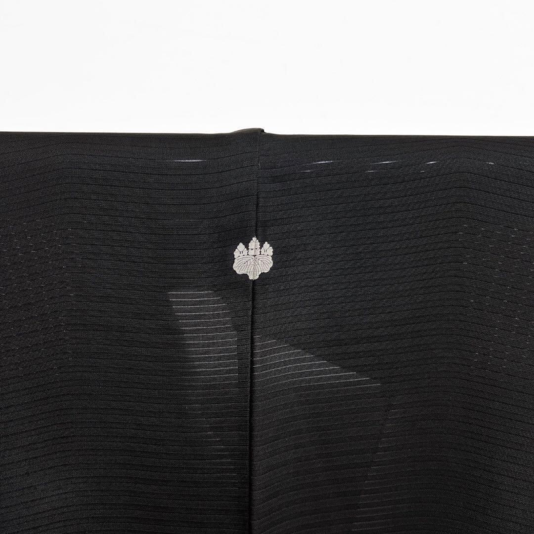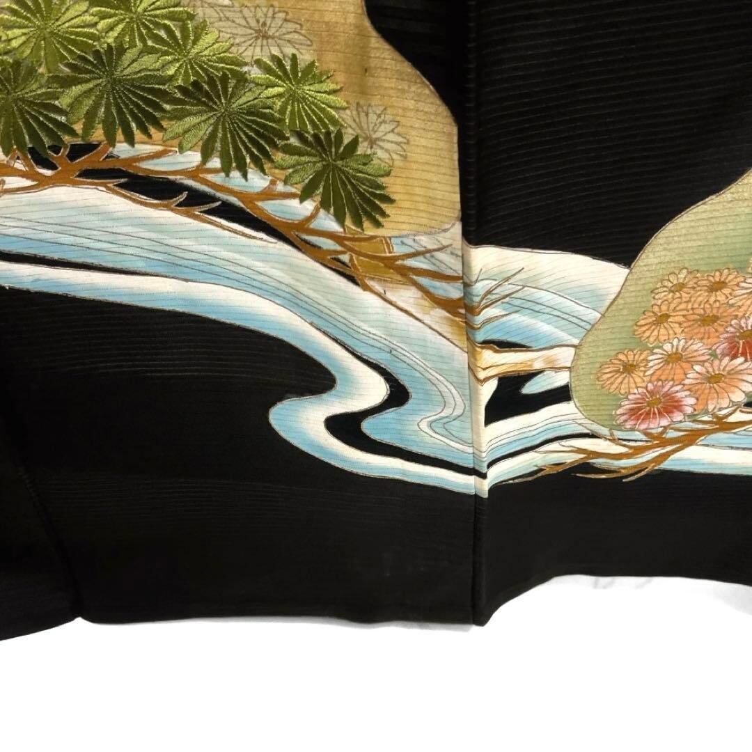 絽の黒地に映える流水に松と金糸銀糸を交えた菊花の刺繍が華やかで絢爛な雰囲気の一着です。