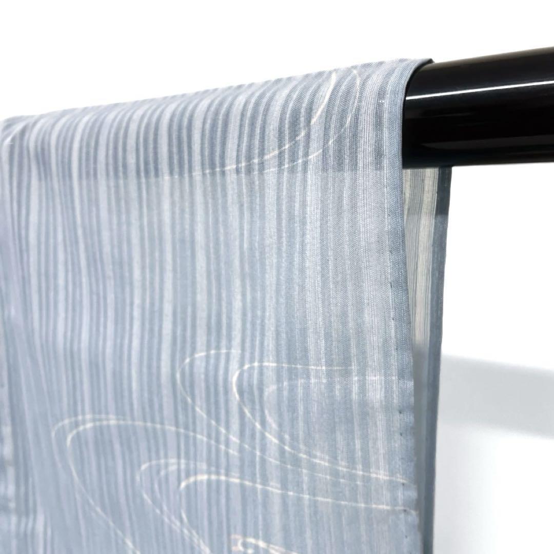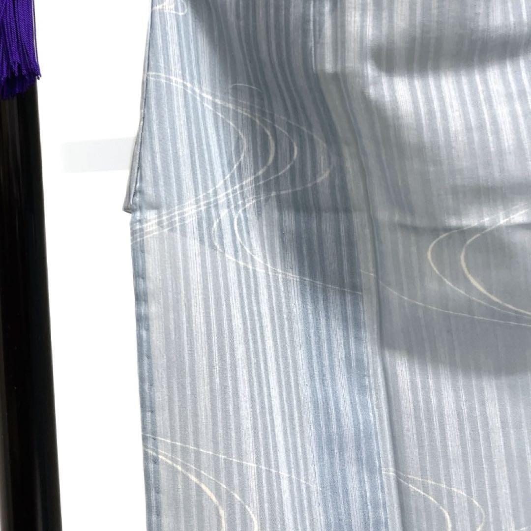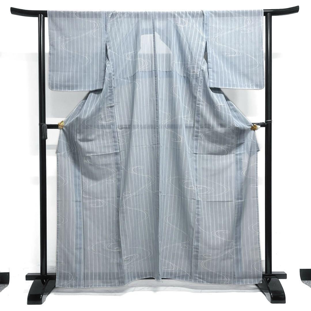 縦縞地紋のくすみのあるライトブルーの紗の地に流水の文様が描かれた涼やかでお洒落なデザインの一着です。