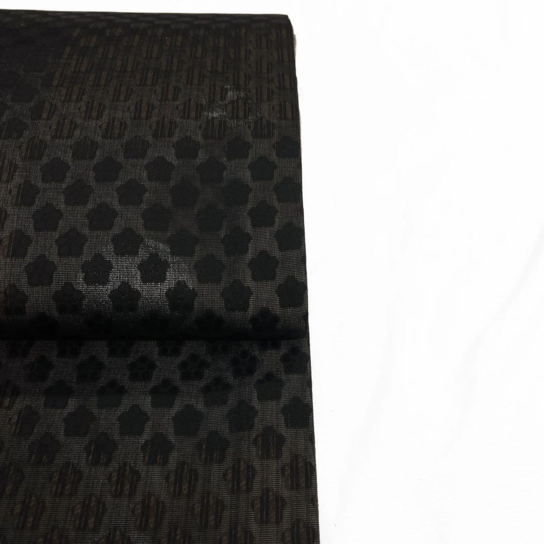 シルバーの円模様や幾何学模様の上に二重で紗の地に市松と花模様がダークトーンで織られたお洒落なデザインの一着です。